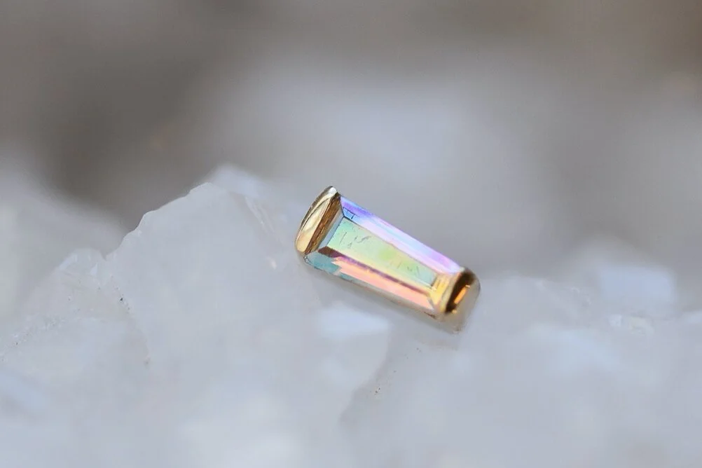 Threadless 2mm x 5mm 14k gold tapered baguette cut CZ or Mercury Mist. Jewelry in photo features Mercury Mist set in Yellow Gold.