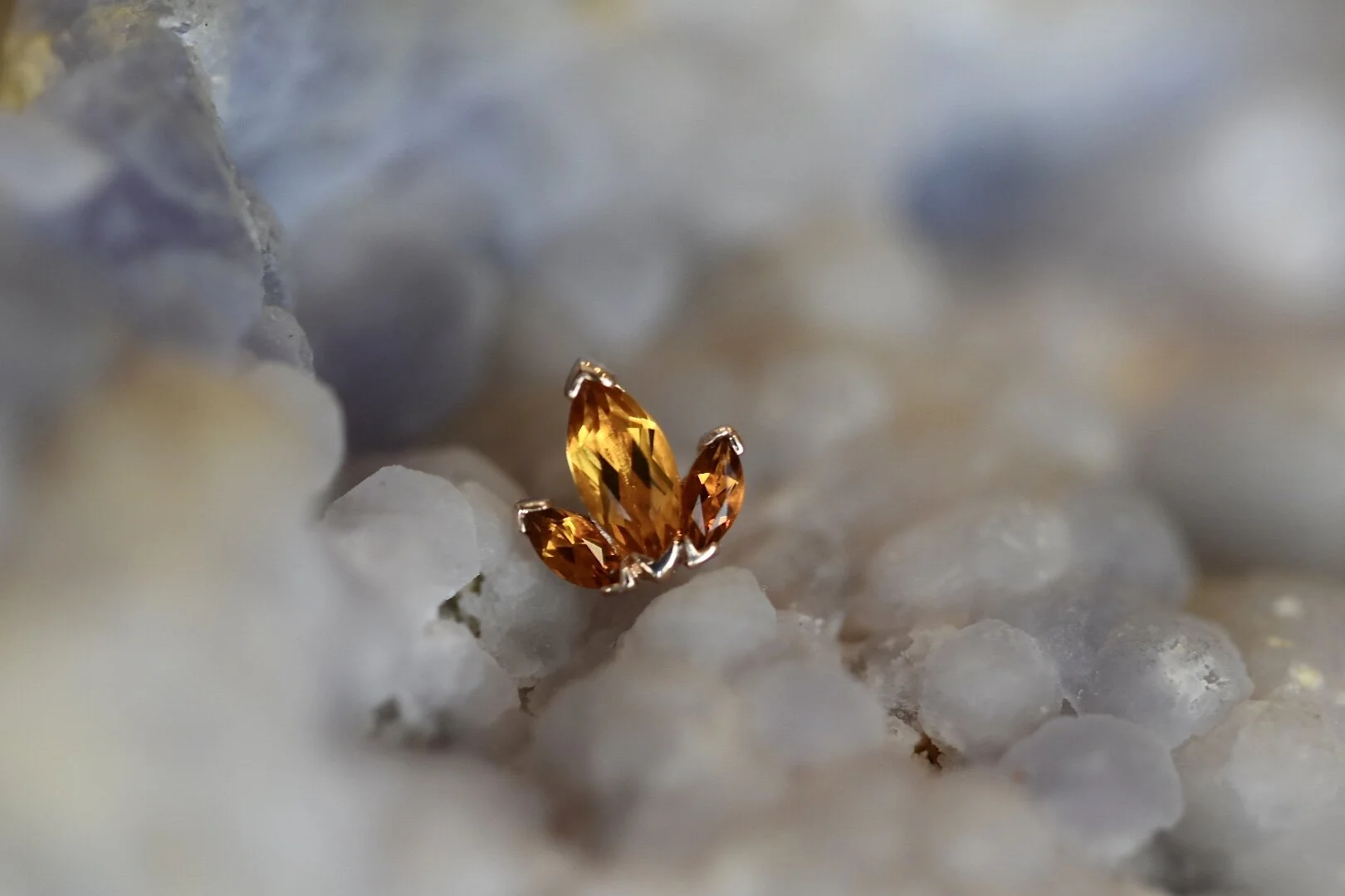 A beautiful trio of marquise cut genuine stones set in 14k solid rose gold. Each outer stone measures 3 x 1.5mm and the center stone measures 5 x 2.5mm. Made with genuine Citrine and compatible with 16g internally threaded posts.