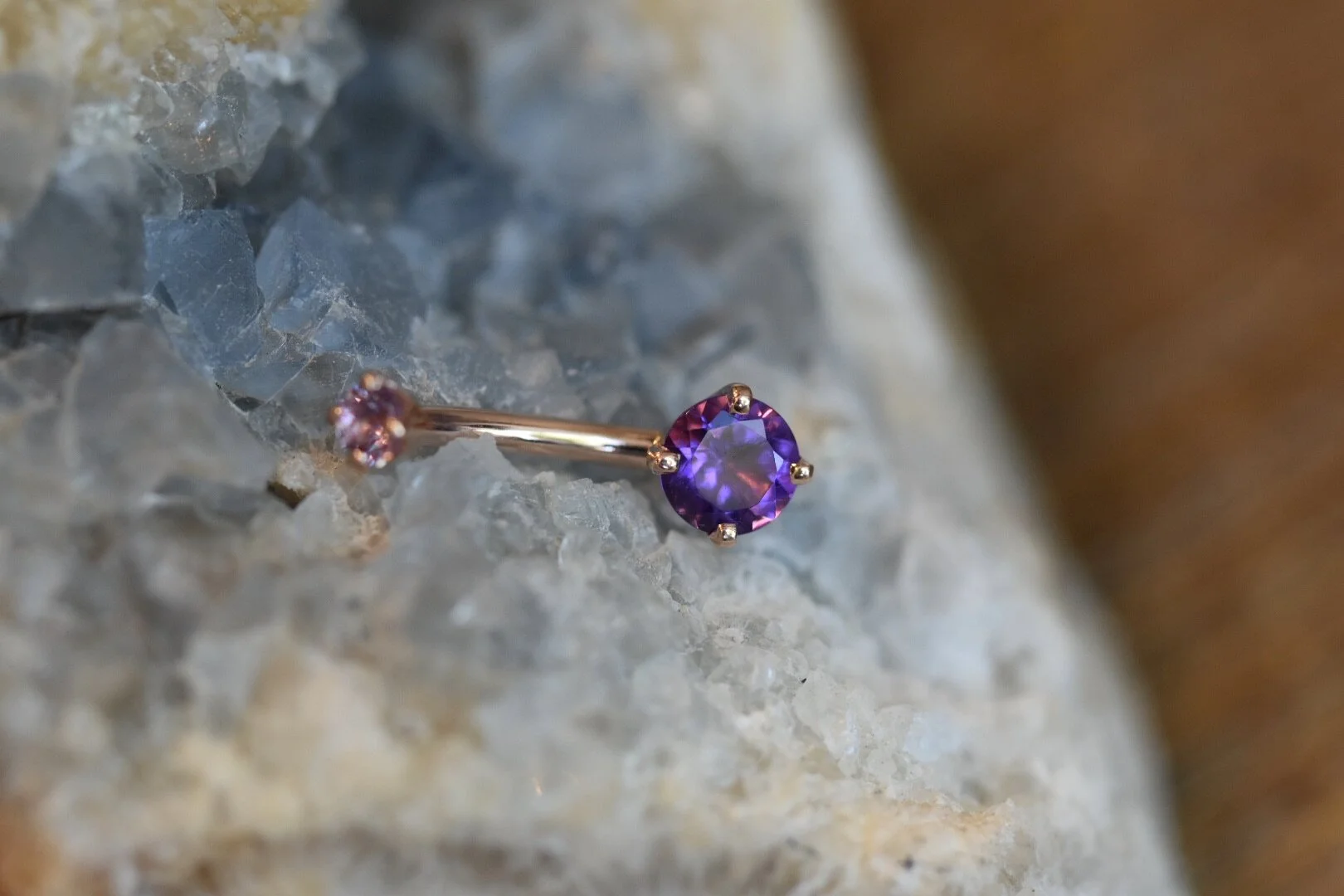 14k solid rose gold navel piece from BVLA. This piece is made with a 5mm Amethyst bottom gem, and a 3mm LIGHT Amethyst top. It is 14g 3/8” wearable.