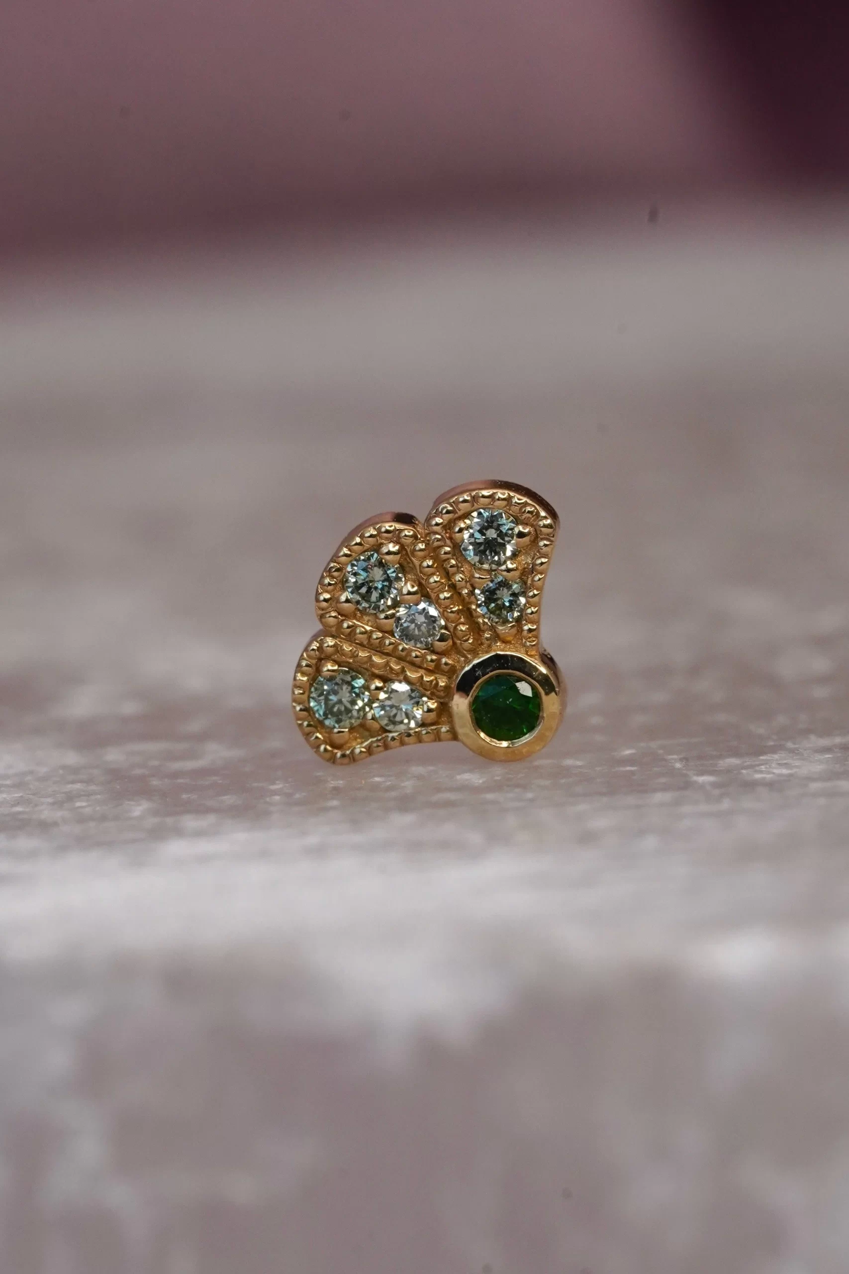 The Arden handcrafted by Body Vision Los Angeles in 14 karat Yellow Gold featuring genuine Chrome Green Tourmaline and Irradiated Pine Green Diamonds. This piece is 7x6mm diameter with 1.5mm, 1.25mm and 1mm gems. Compatible with 18/16 gauge internally threaded Industrial Strength post sold separately. This would be a fantastic statement piece in a flat or conch piercing!