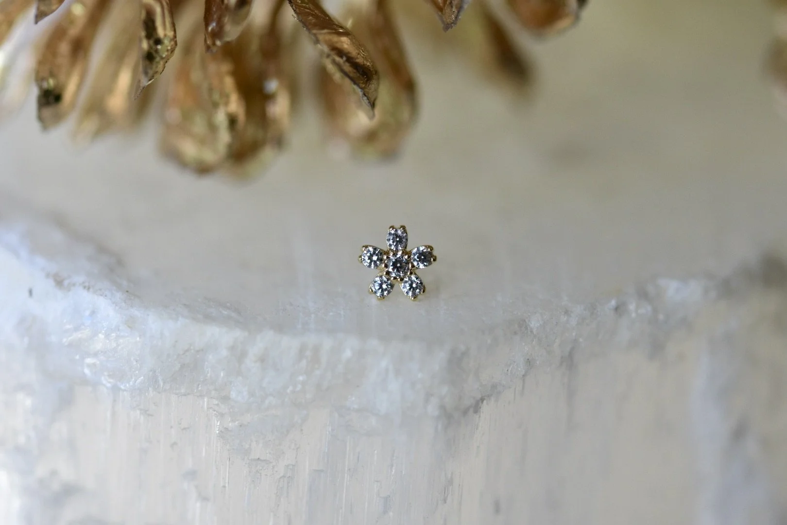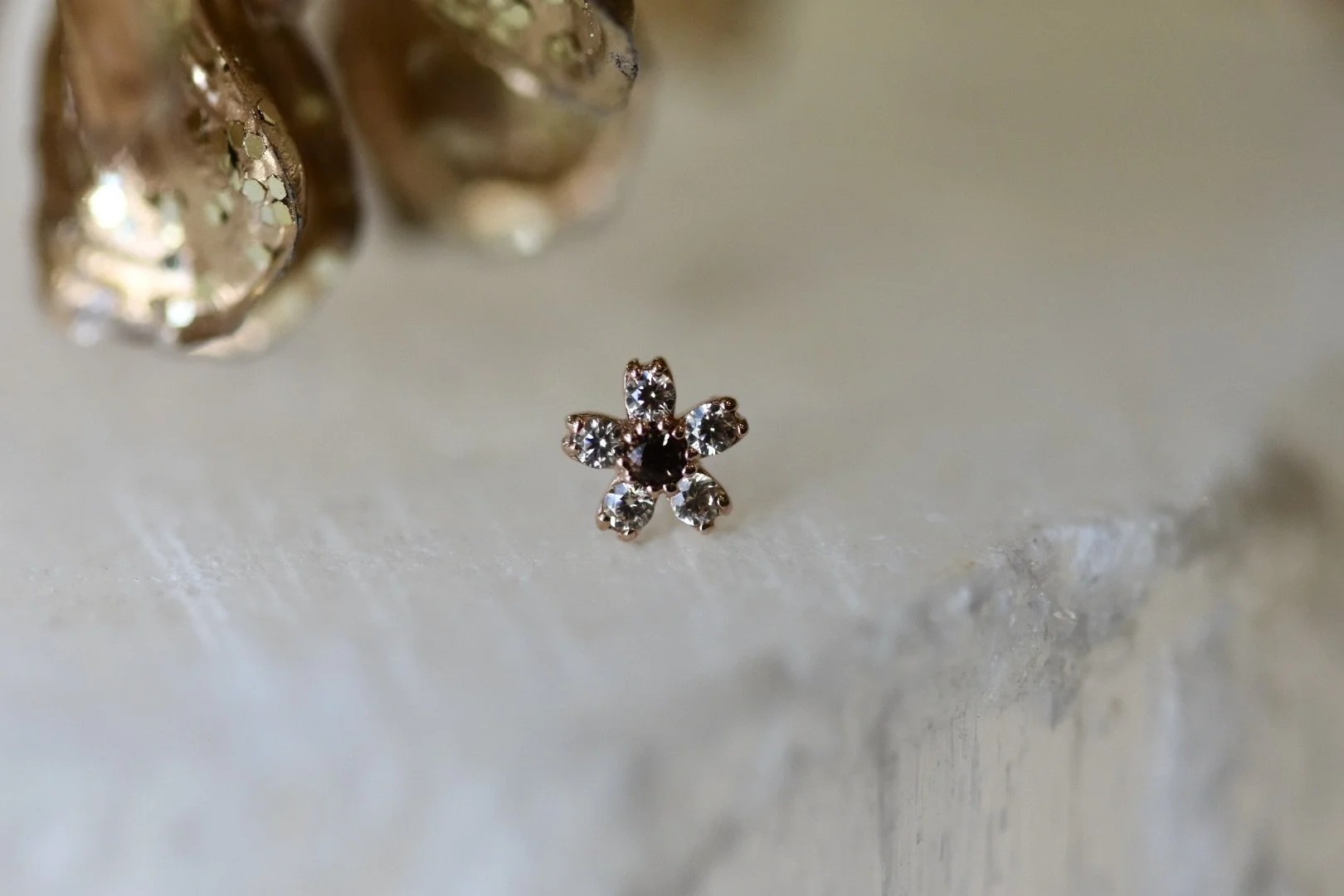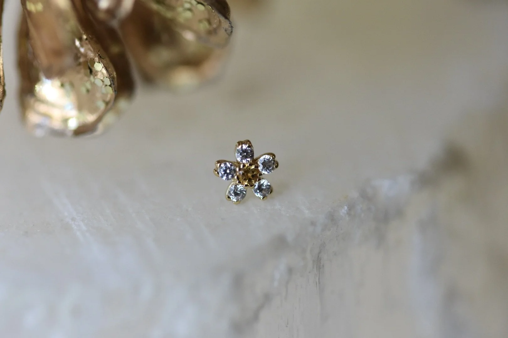 These adorable Cherry Blossom threadless tops handcrafted by Body Vision Los Angeles are made with 14 karat solid gold and genuine gemstones! Each top is 6mm in overall size with 1.75mm gemstones. Compatible with NeoMetal threadless post sold separately.