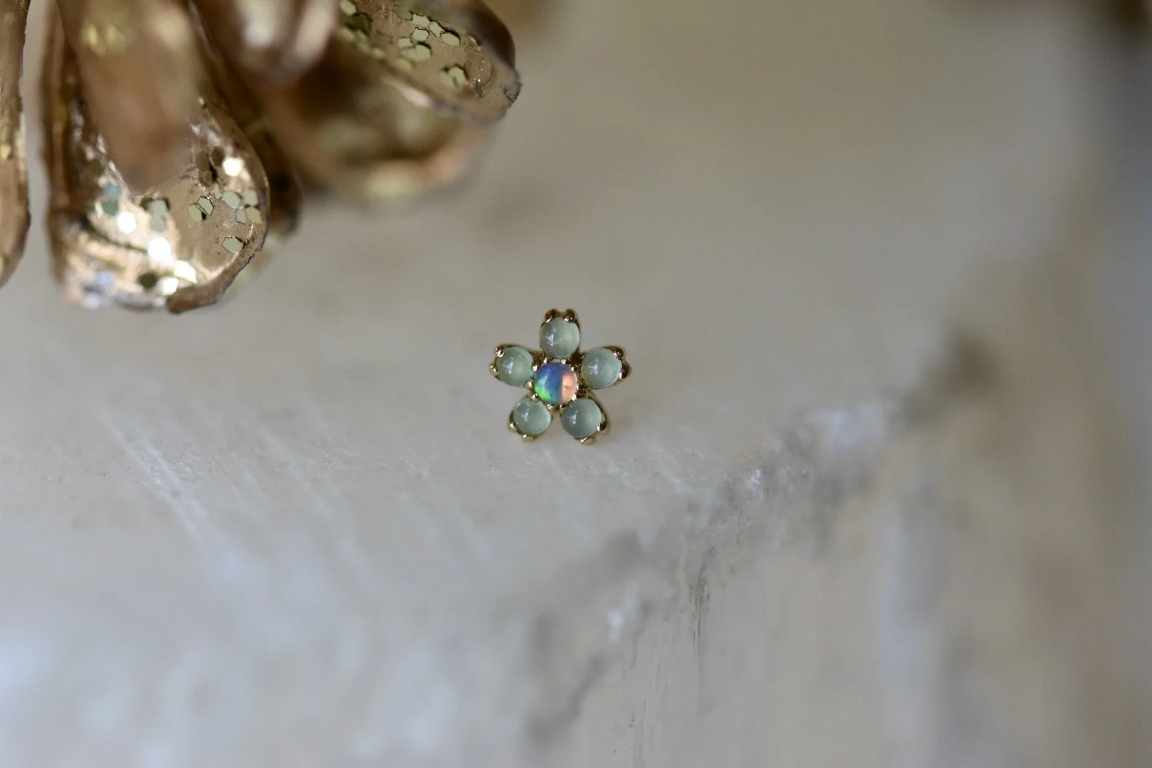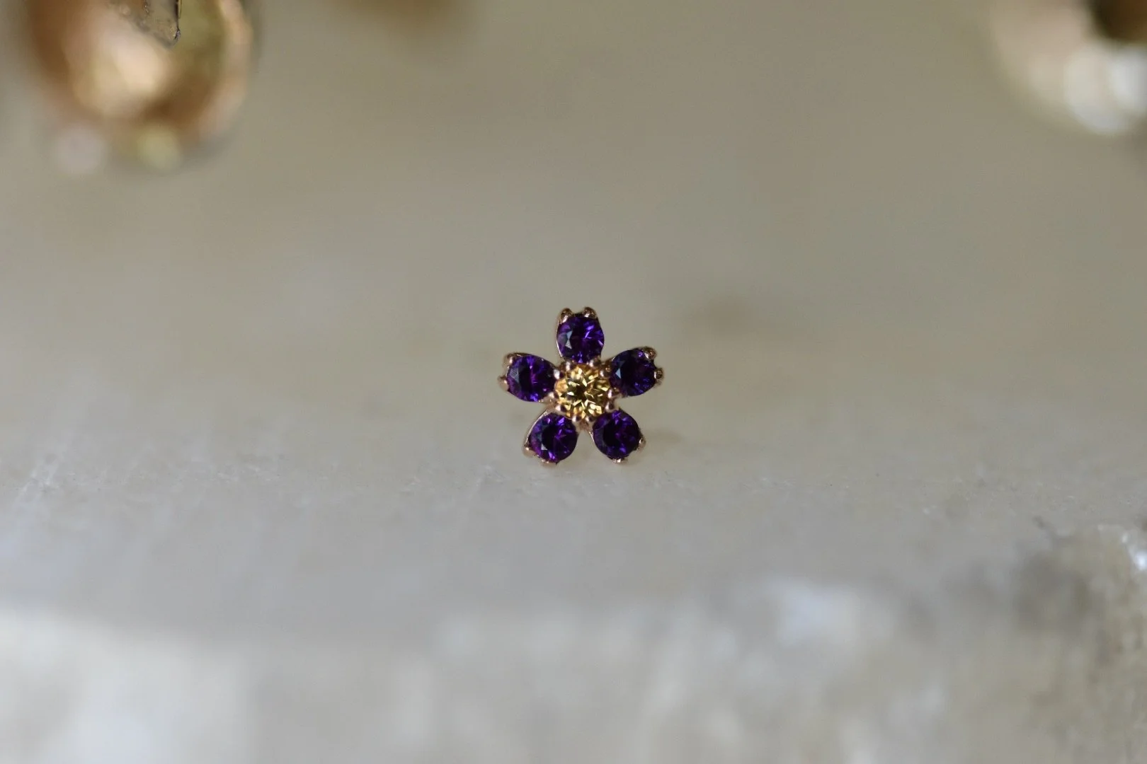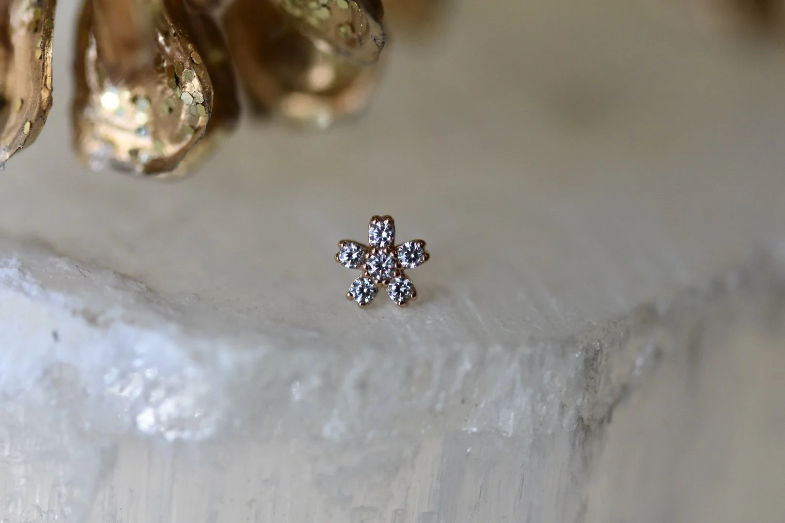 These adorable Cherry Blossom threadless tops handcrafted by Body Vision Los Angeles are made with 14 karat solid gold and genuine gemstones! Each top is 6mm in overall size with 1.75mm gemstones. Compatible with NeoMetal threadless post sold separately.