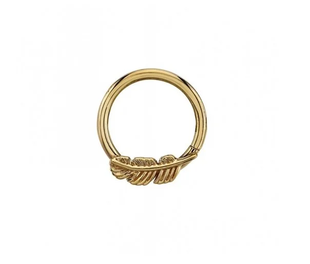The feather seam ring is handcrafted by Body Vision Los Angeles in 14 karat yellow, rose, or white gold with a 9mm feather. Orientation is set for a septum or daith piercing!