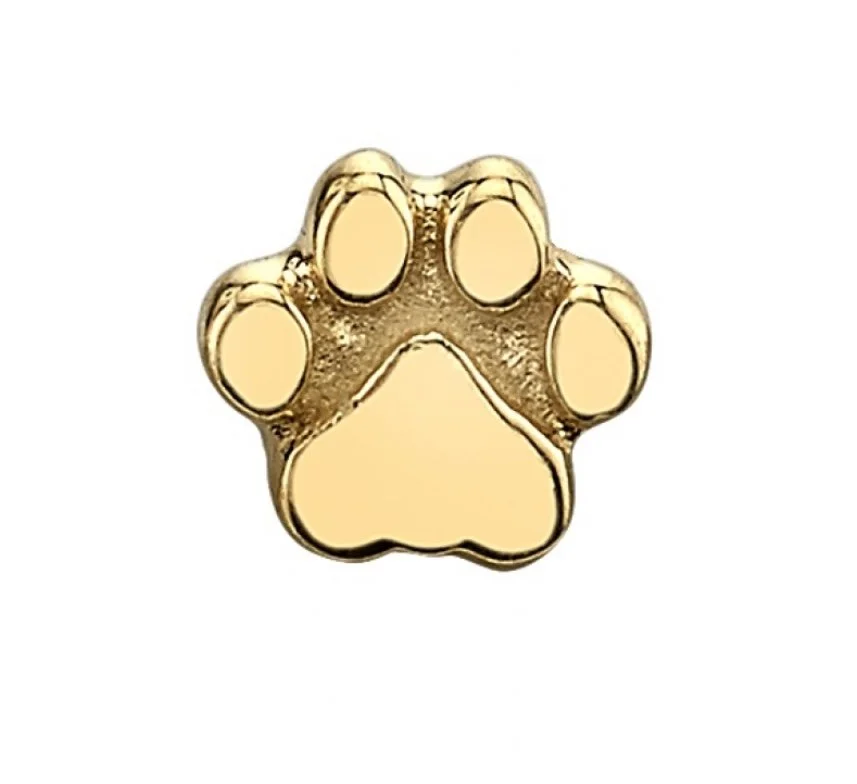 Adorable internally threaded flat paw prints handcrafted by Body Vision Los Angeles in 14 karat yellow gold. Each top is 4mm and compatible with 16/18 gauge Industrial Strength threaded post sold sepa