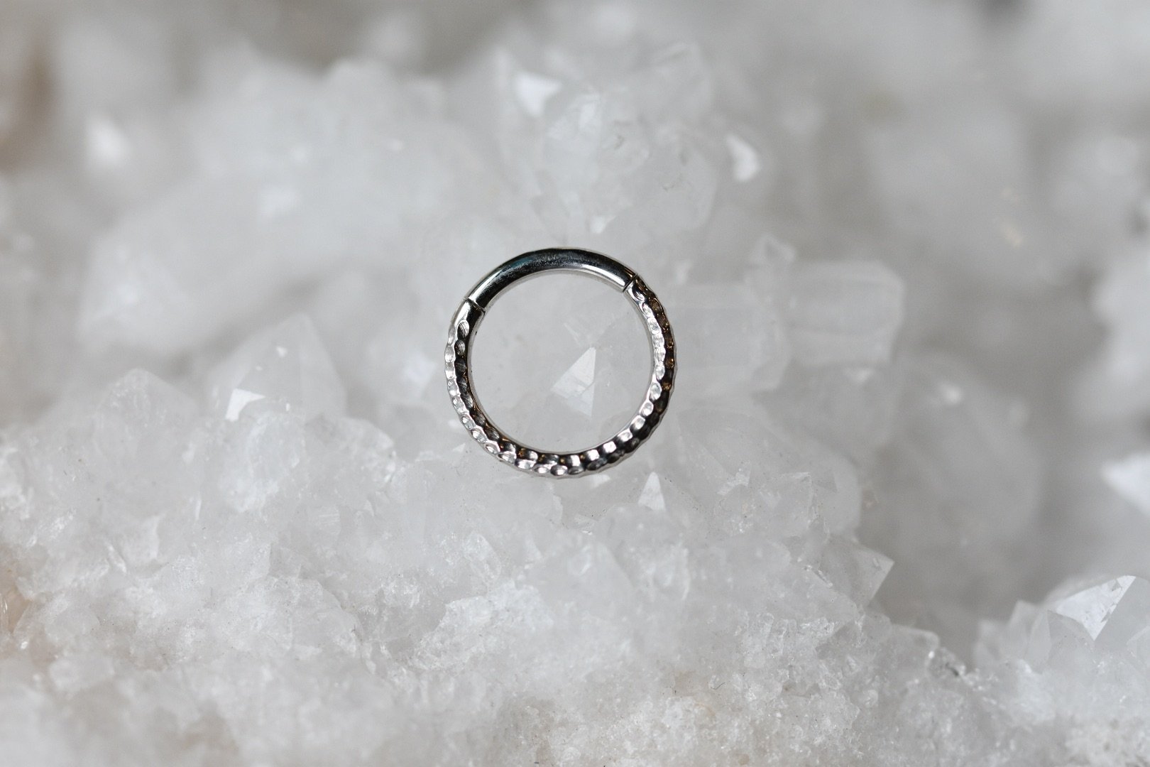 The hammered Hinge ring handcrafted by Body Vision Los Angeles in 14 karat white gold. This piece is 5/16” in diameter and 16 gauge. Perfect for a simple yet classic look in a variety of piercings.