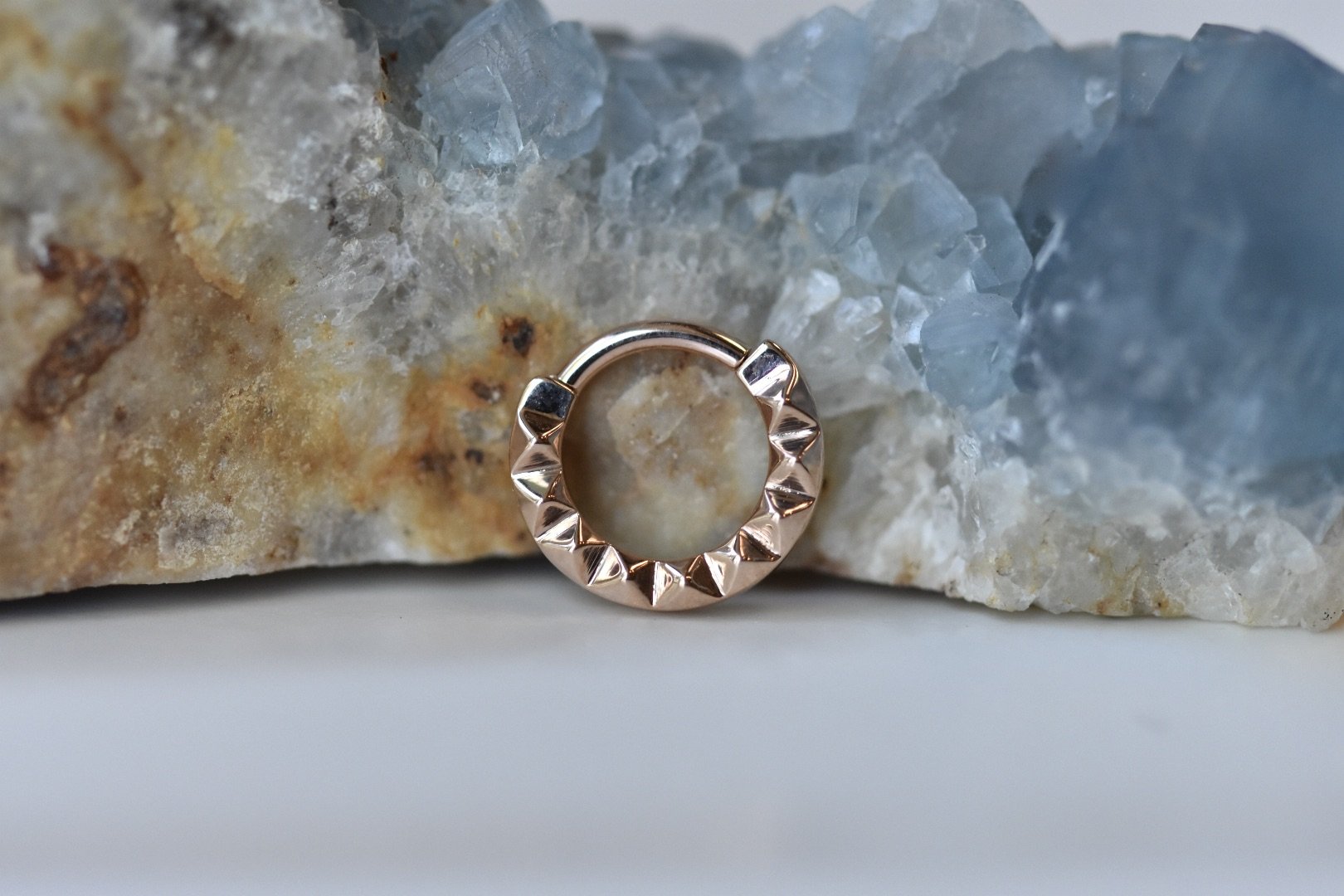16 gauge “Havok” hinge ring handcrafted by Body Vision Los Angeles in 14 karat solid yellow, rose, or white gold featuring 2mm square pyramids. Currently available in two diameters!