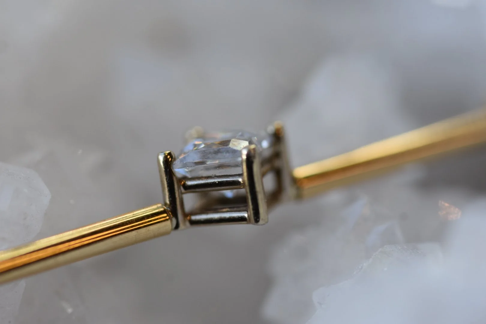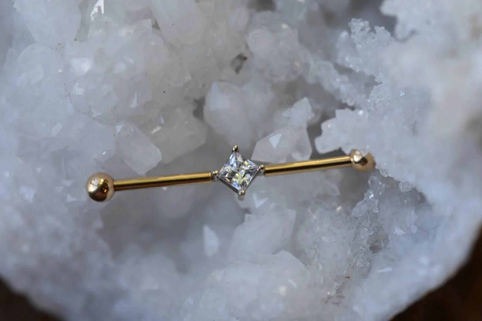 14k solid yellow gold industrial bar from BVLA. This piece features a 4mm princess cut CZ as the center gem with two 1/2 inch bars on each side, for an overall wearing surface of 1 3/16”.