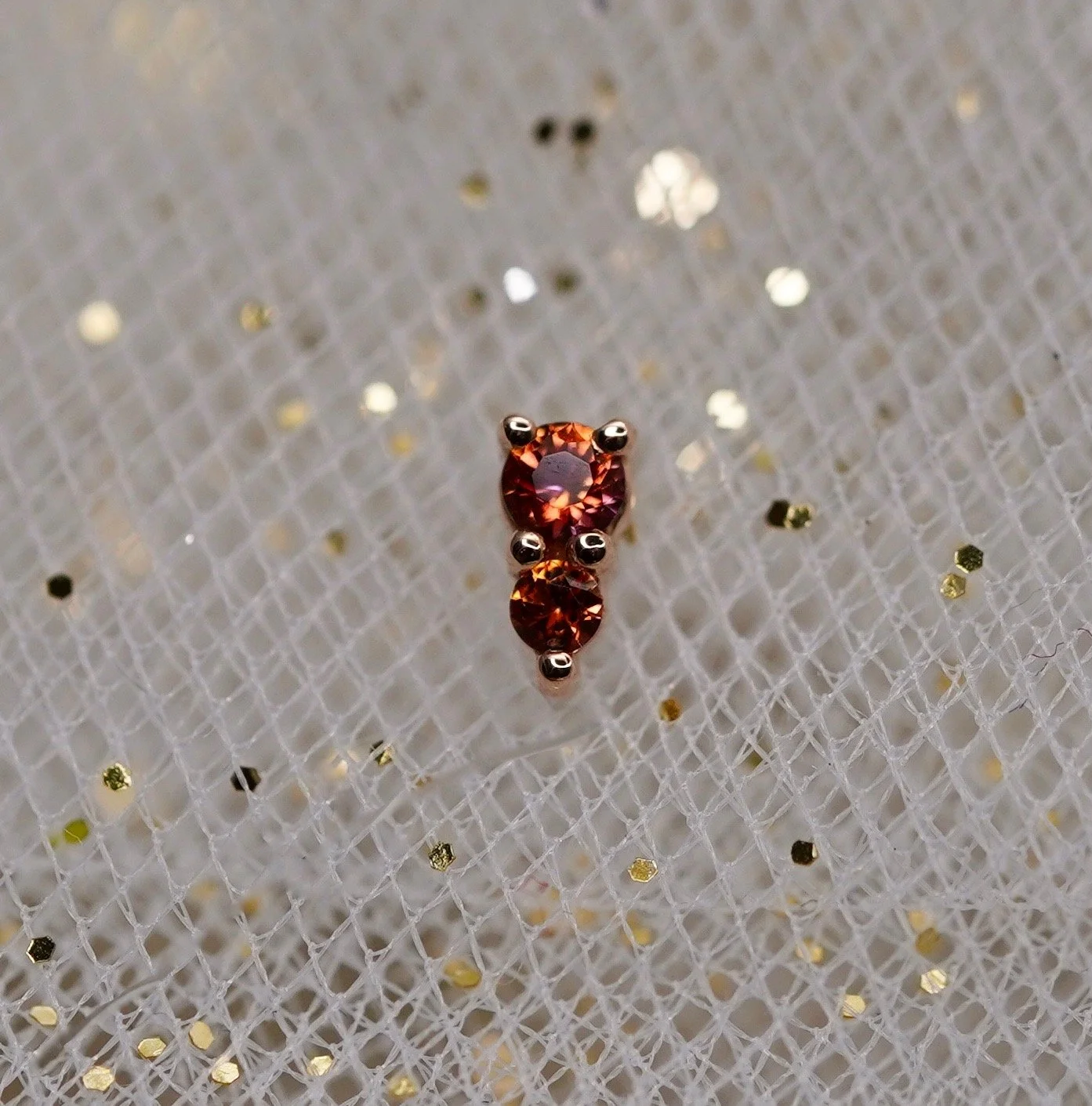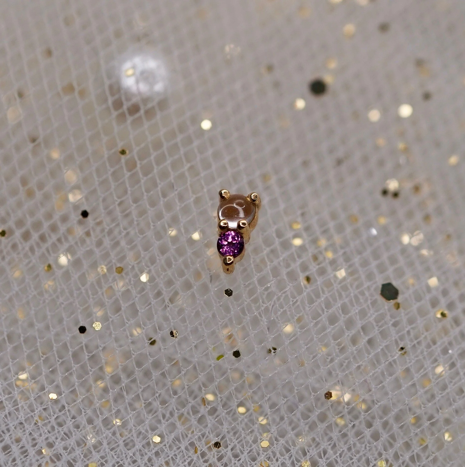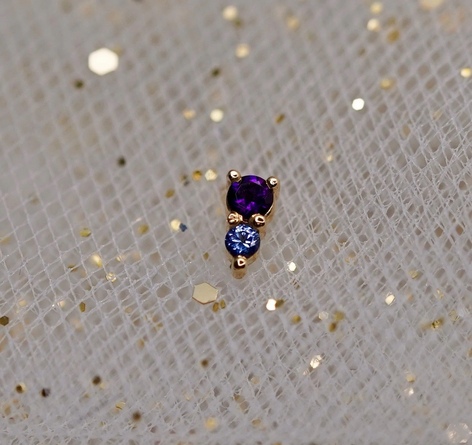 The adorable Jeanie 2 top handcrafted by Body Vision Los Angeles in 14 karat sold gold featuring different genuine gemstones! Each top is 4x2mm in size with a 2mm top gem and 1.5mm bottom gem. Compatible with 18/16 gauge threadless NeoMetal post sold separately.
