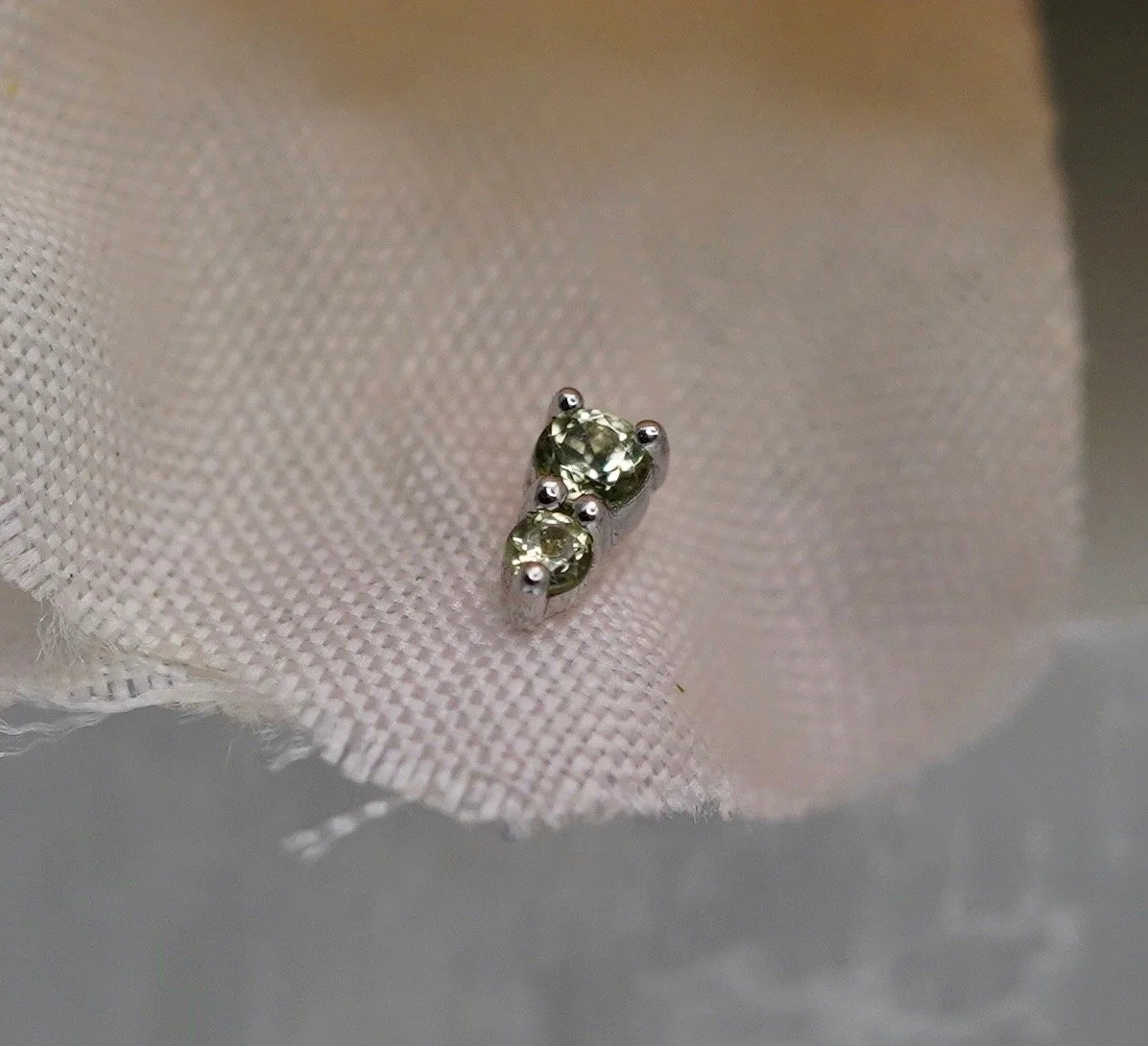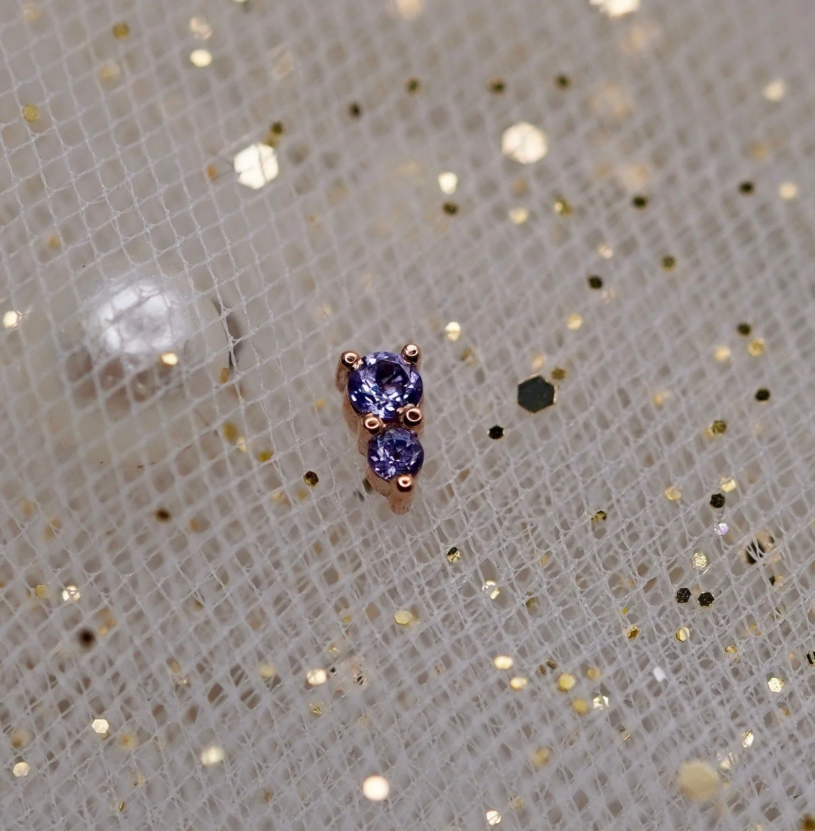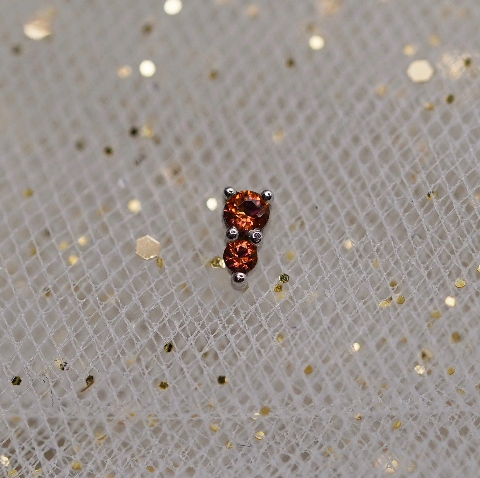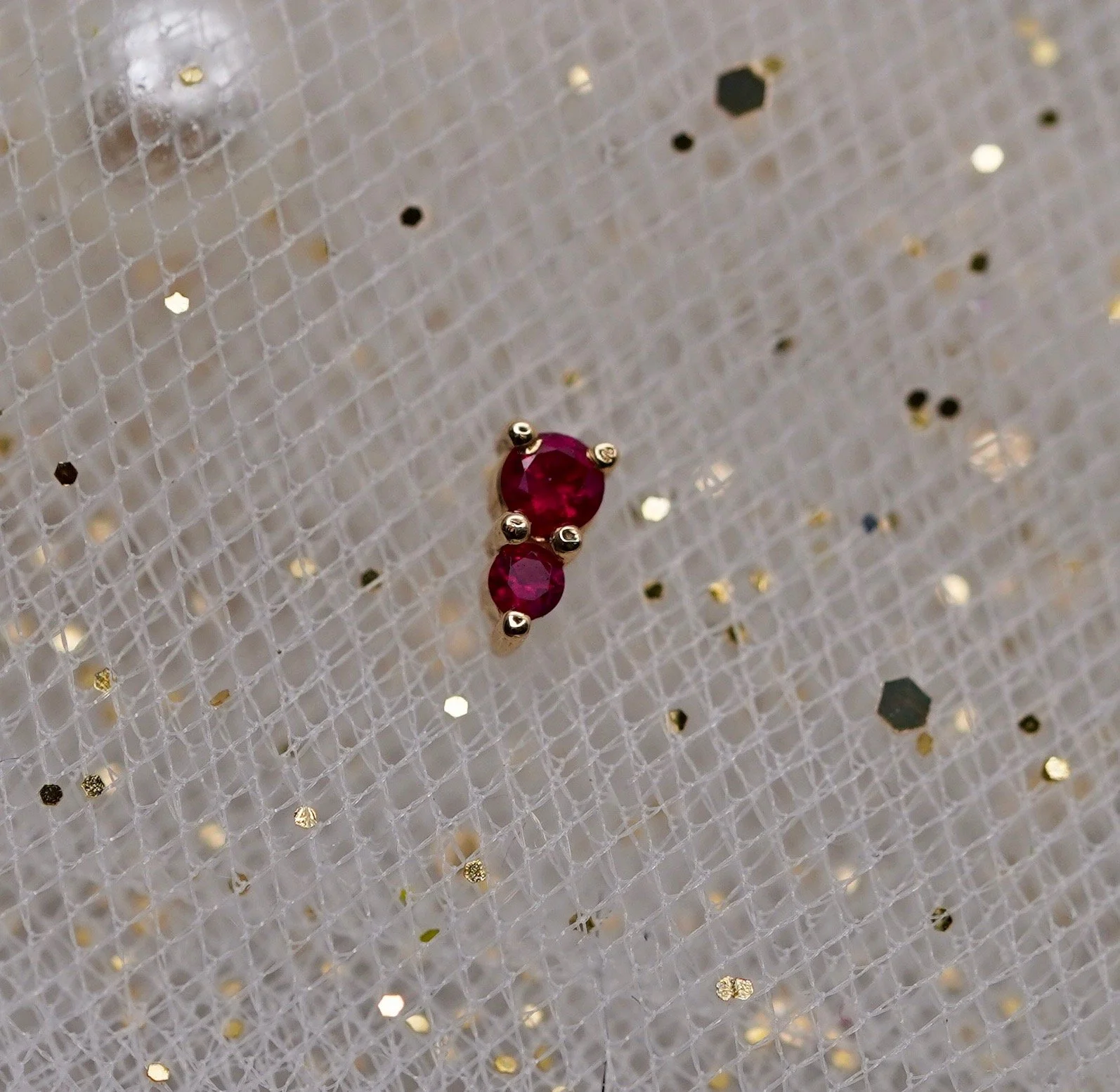 The adorable Jeanie 2 top handcrafted by Body Vision Los Angeles in 14 karat sold gold featuring different genuine gemstones! Each top is 4x2mm in size with a 2mm top gem and 1.5mm bottom gem. Compatible with 18/16 gauge threadless NeoMetal post sold separately.
