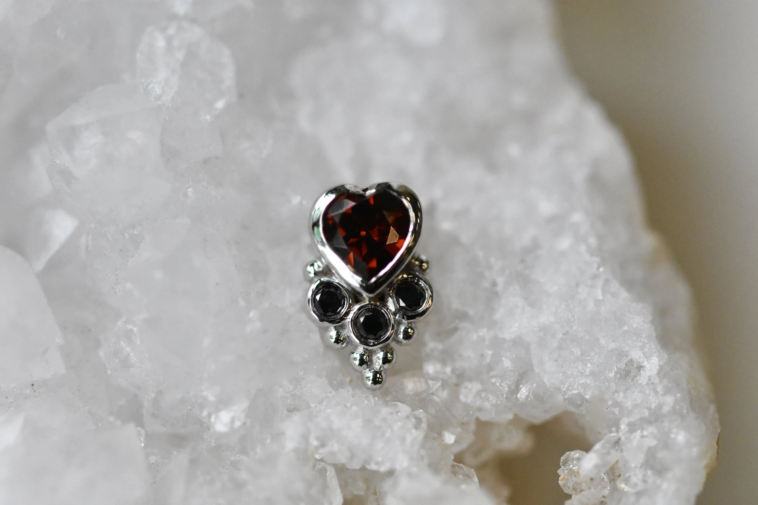 The gorgeous Lucy’s Heart top handcrafted by Body Vision Los Angeles with a 4mm genuine Garnet heart and 1.5mm genuine Black Diamonds bezel set with beaded accents in 14 karat solid white gold. Each top is 9x6mm in overall size. Compatible with 16/18 gauge internally threaded Industrial Strength post sold separately.