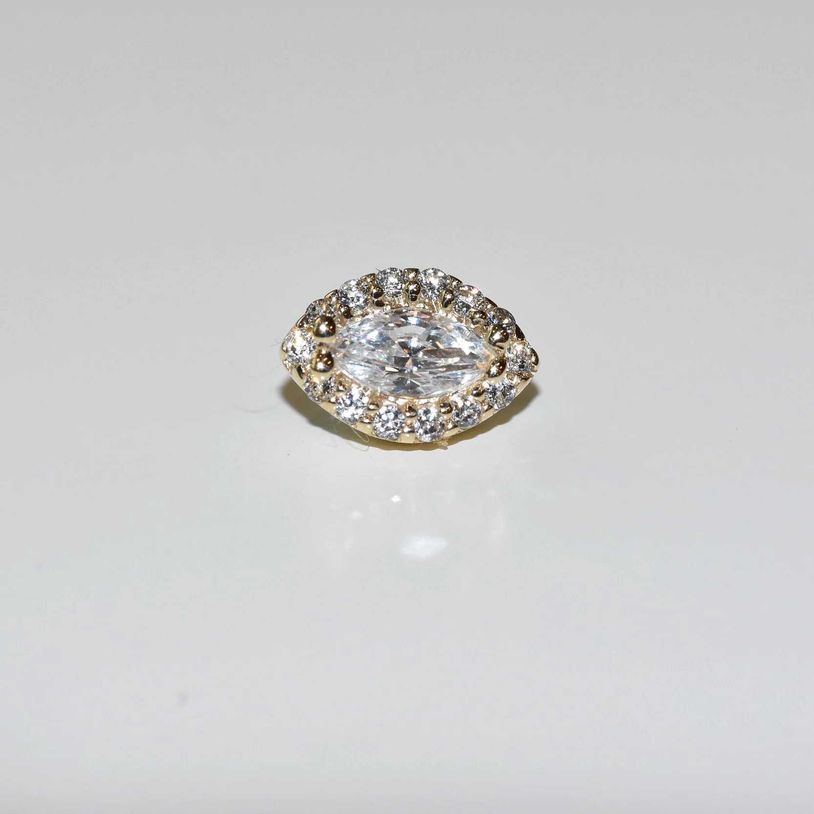 This piece is made of solid 14k yellow gold and has all white swarovski gems. It is compatible with 18g/16g internally threaded posts.