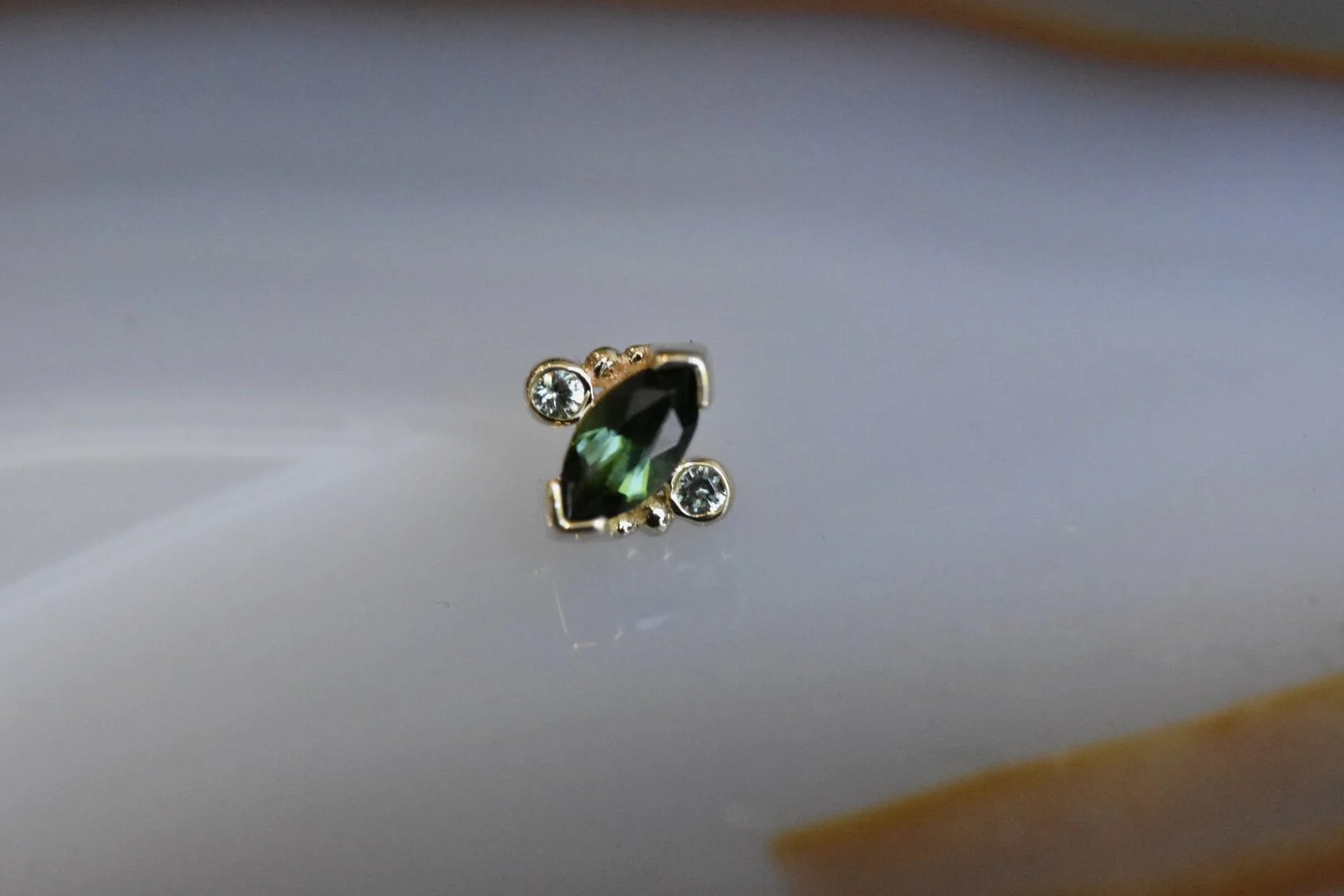 A 4 x 2mm marquise cut stone with two 1mm bezel set stones on the outside. These beautiful pieces are made with genuine Green Tourmaline in the center with genuine Peridot on the outside. Made with 14k solid gold and compatible with 16g internally threaded posts.