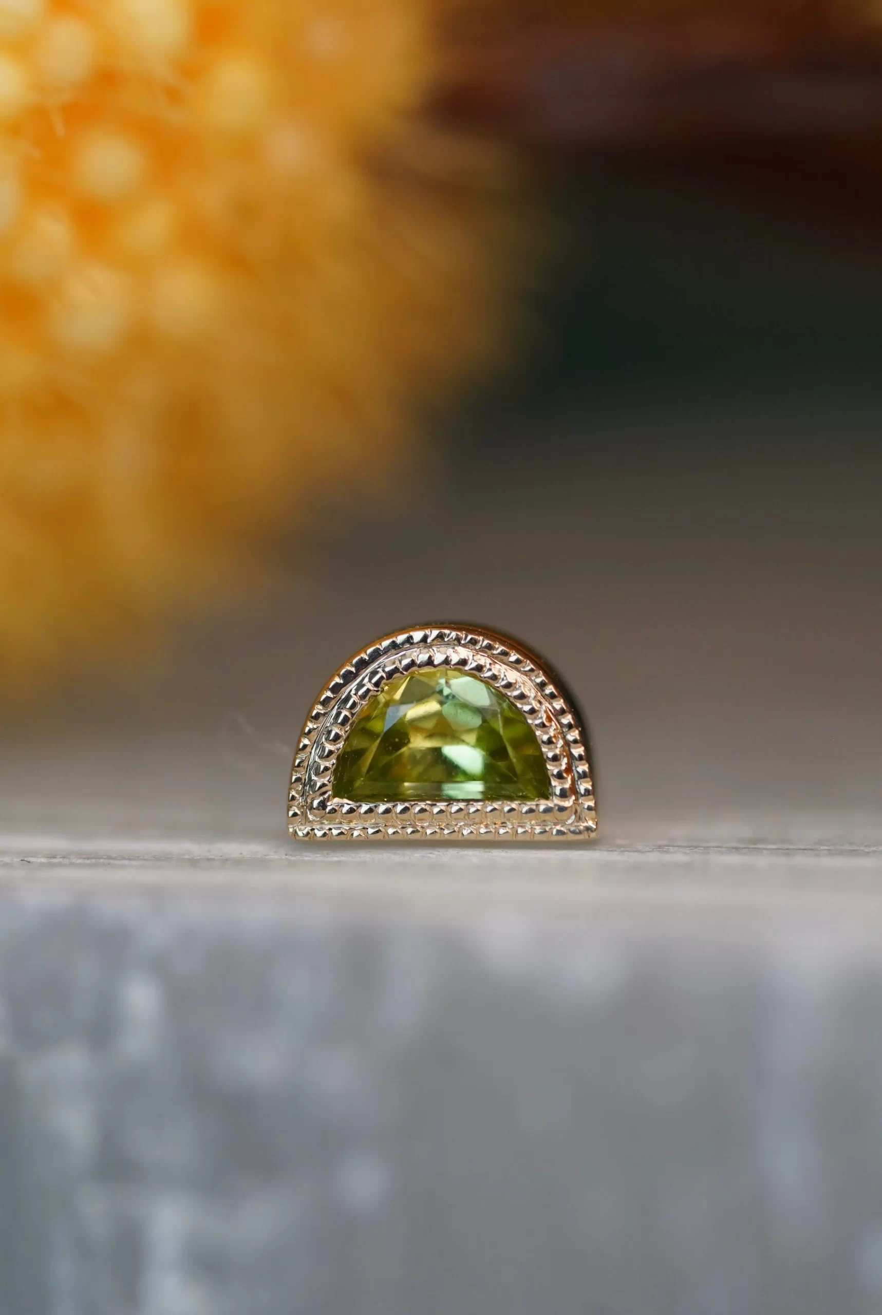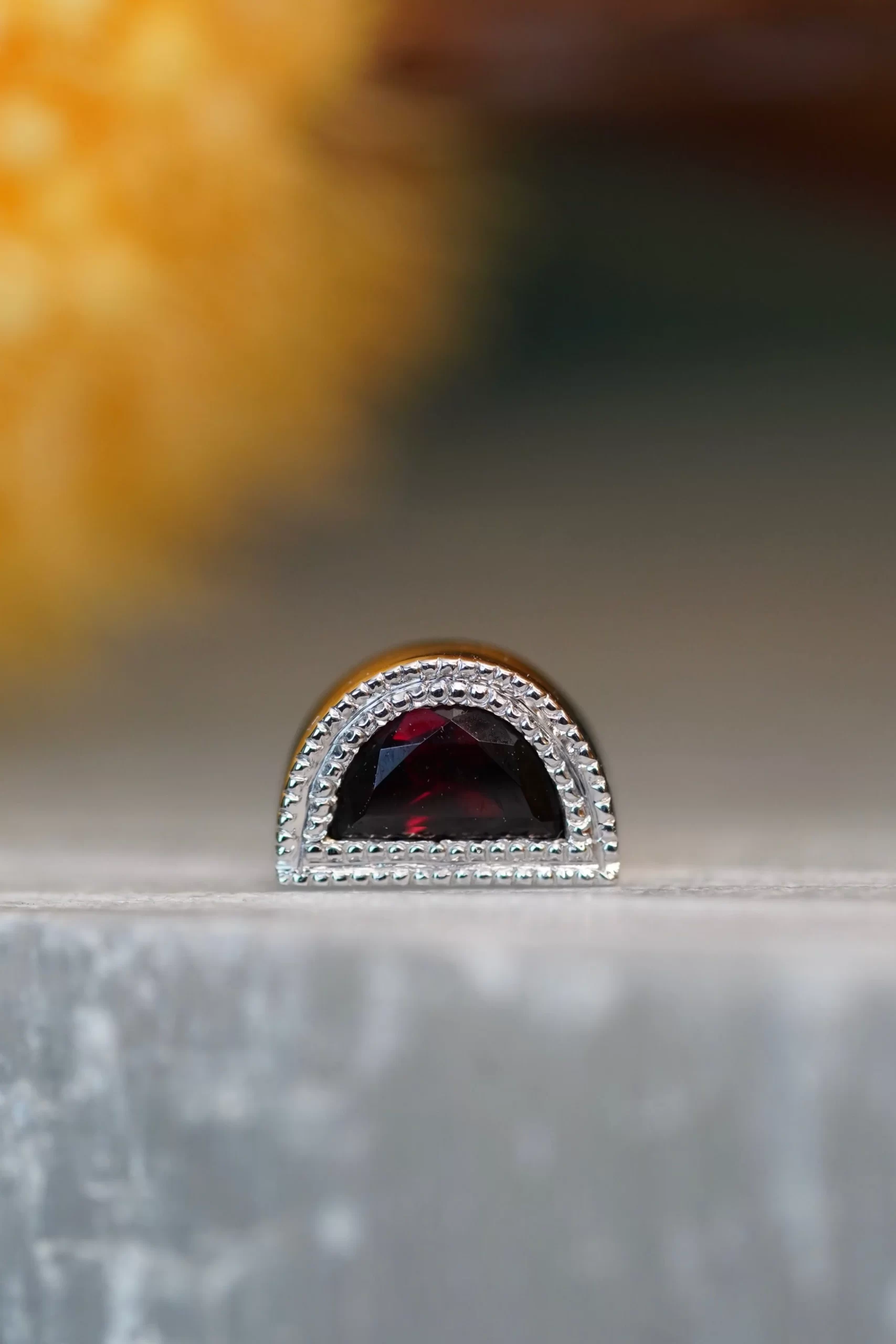 The BVLA “Milgrain Half Moon Bezel” is a beautifully detailed piece. Each piece has a total diameter of 6.5×4.5mm with a 5×3mm gemstone. They are all set in 14 karat solid gold with genuine gemstones! Compatible with an 18 or 16 gauge Industrial Strength post sold separately.