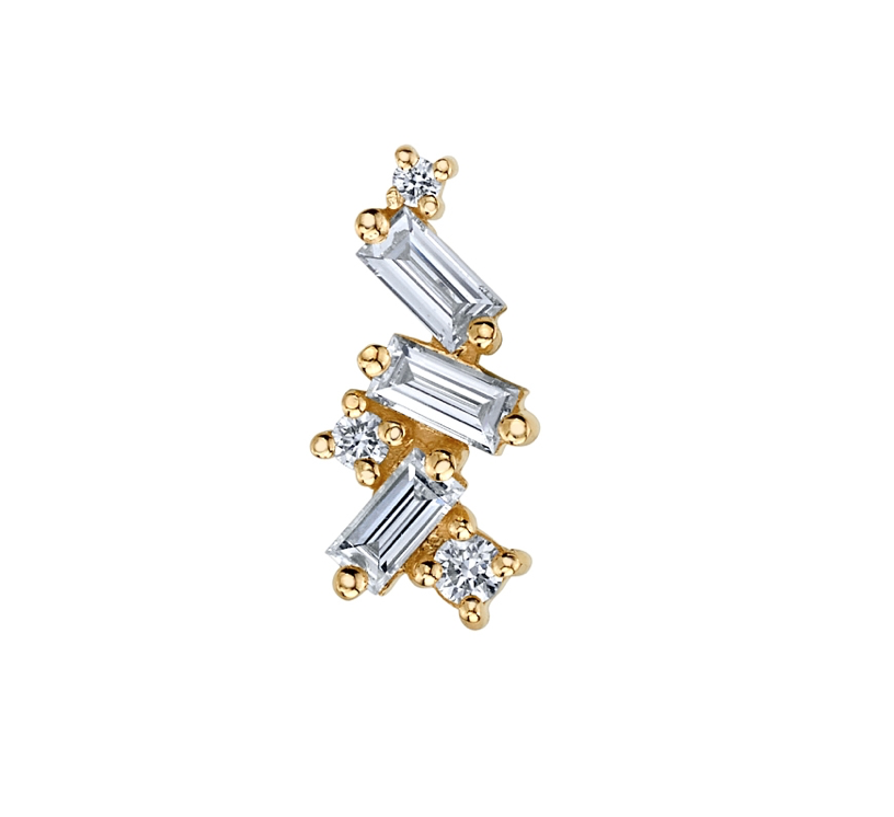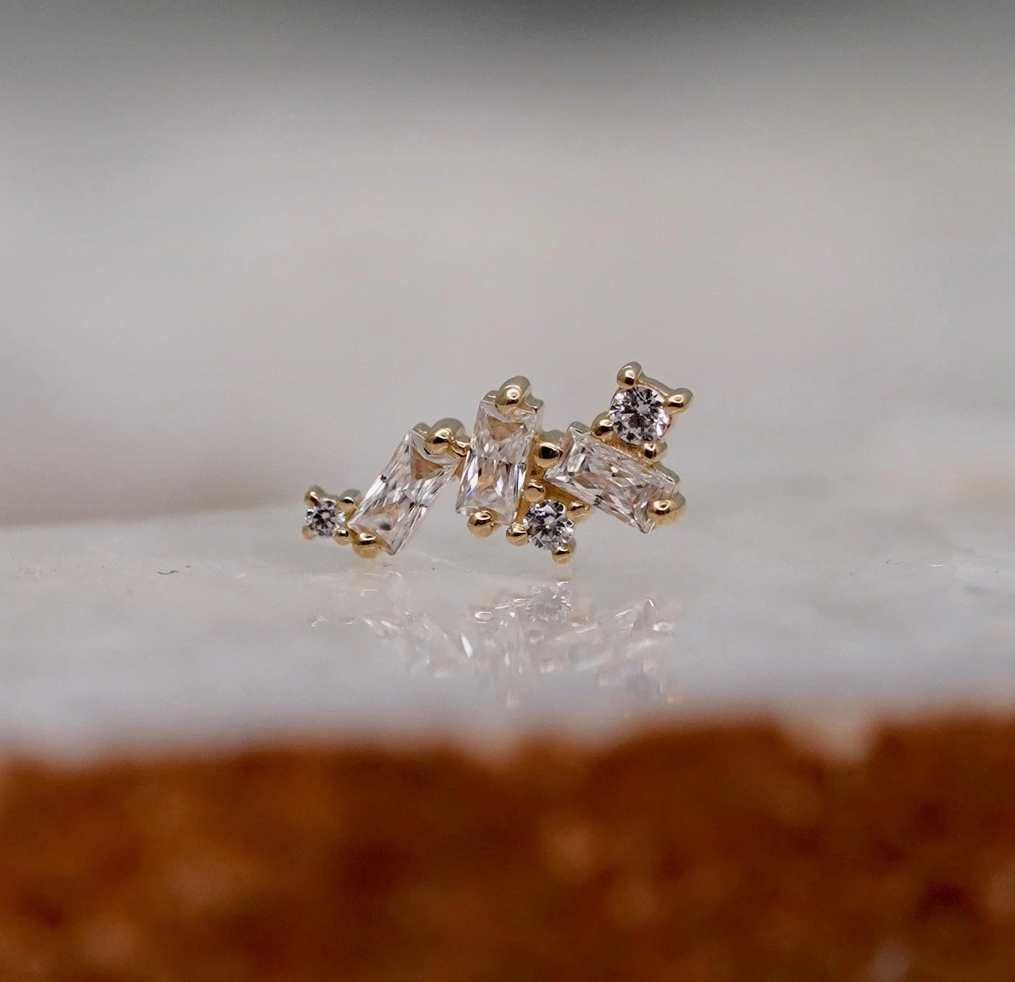 The Mini Genesis top handcrafted by Body Vision Los Angeles in 14 karat solid yellow gold featuring white Cubic Zirconia’s. Available in left and right ear orientation. Each piece is 9×4.5mm diameter with 3×1.5mm, 1.5mm, 1.25mm, and 1mm gems. Compatible with 16/18 gauge internally threaded Industrial Strength post sold separately.