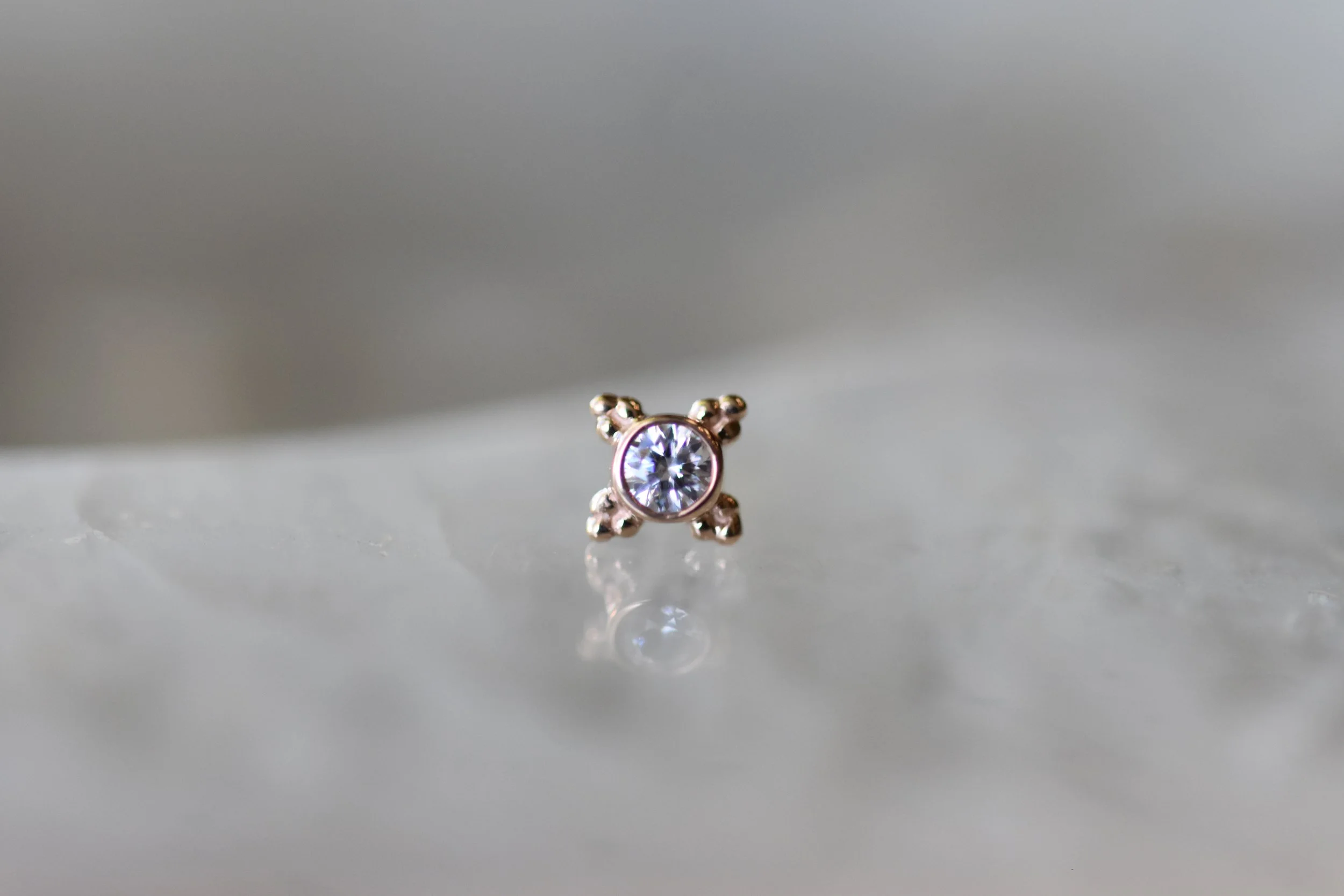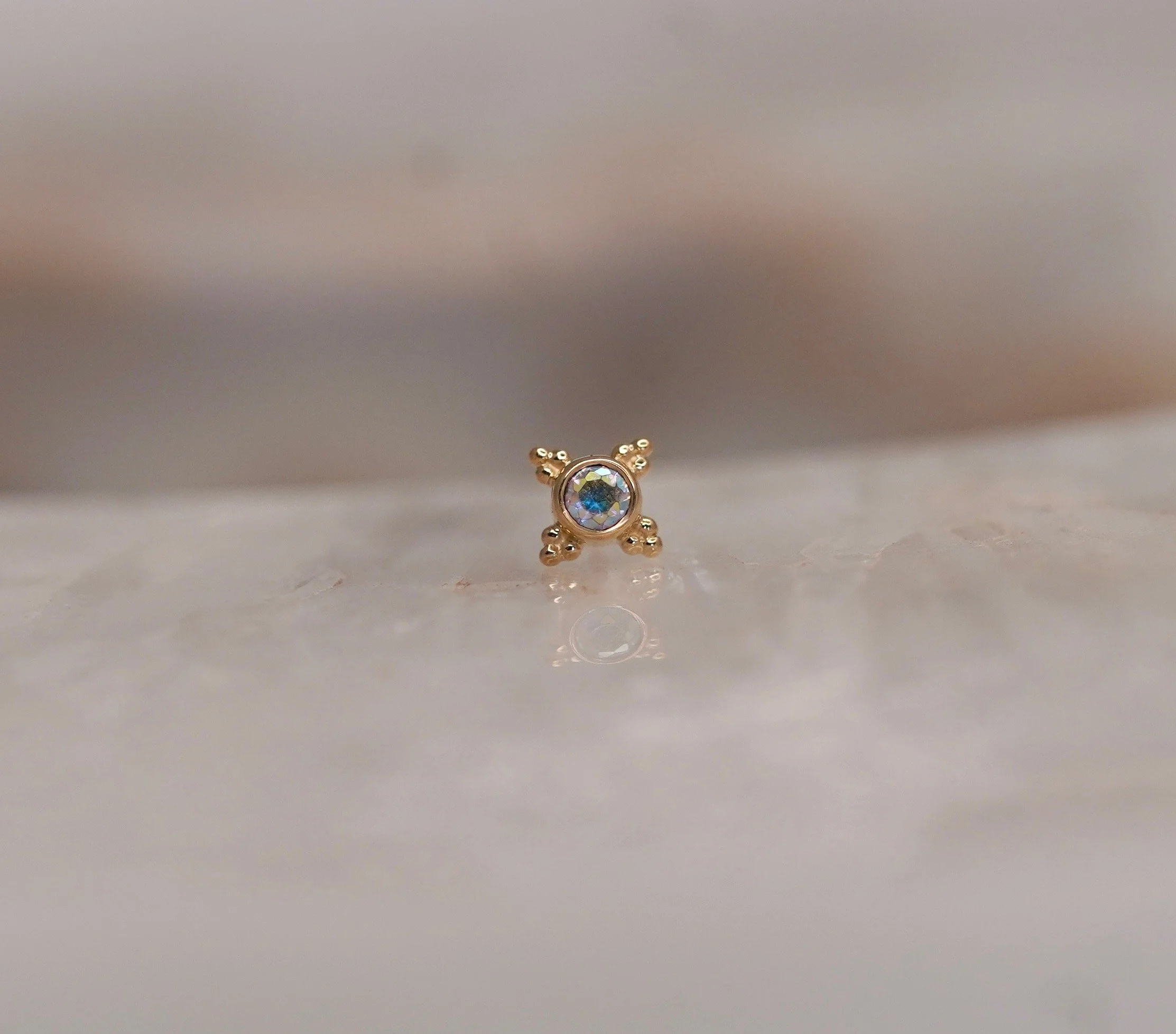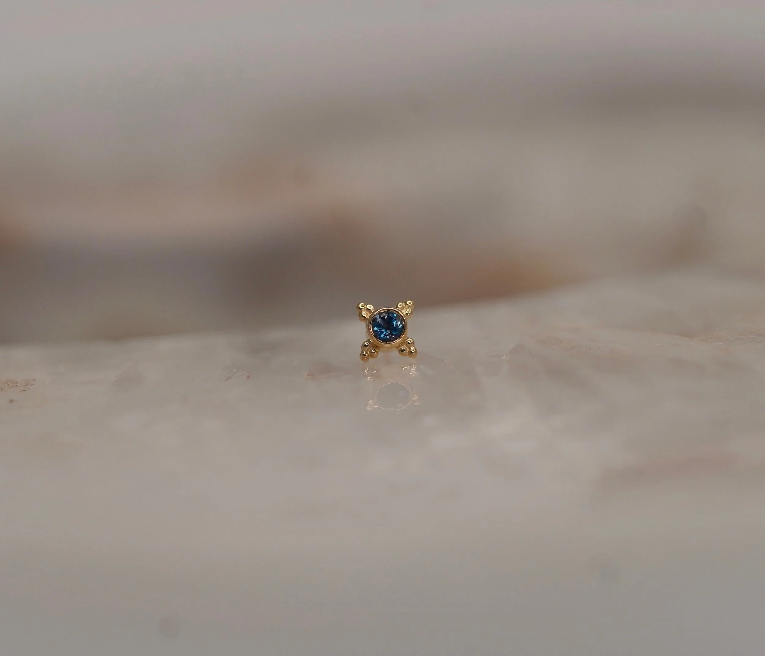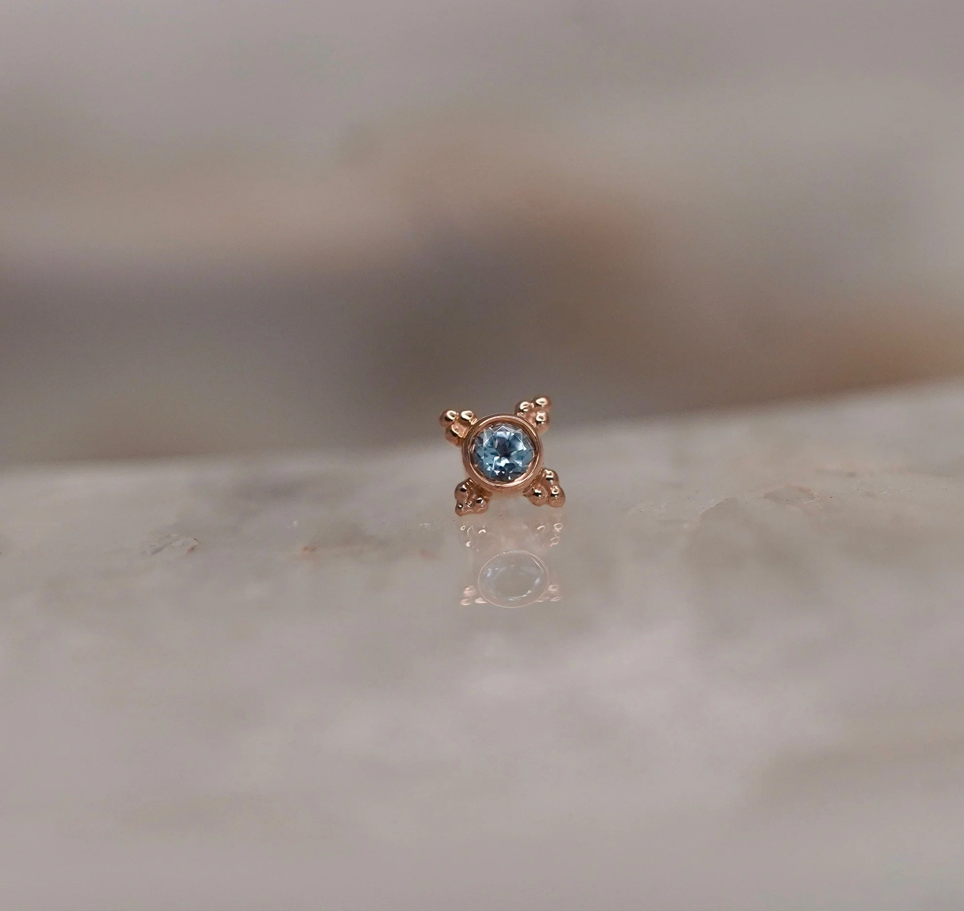 14k Mini Kandy from Body Vision Los Angeles. 5mm overall with a 2mm center stone in each. Compatible with an 18g Neometal threadless back piece.