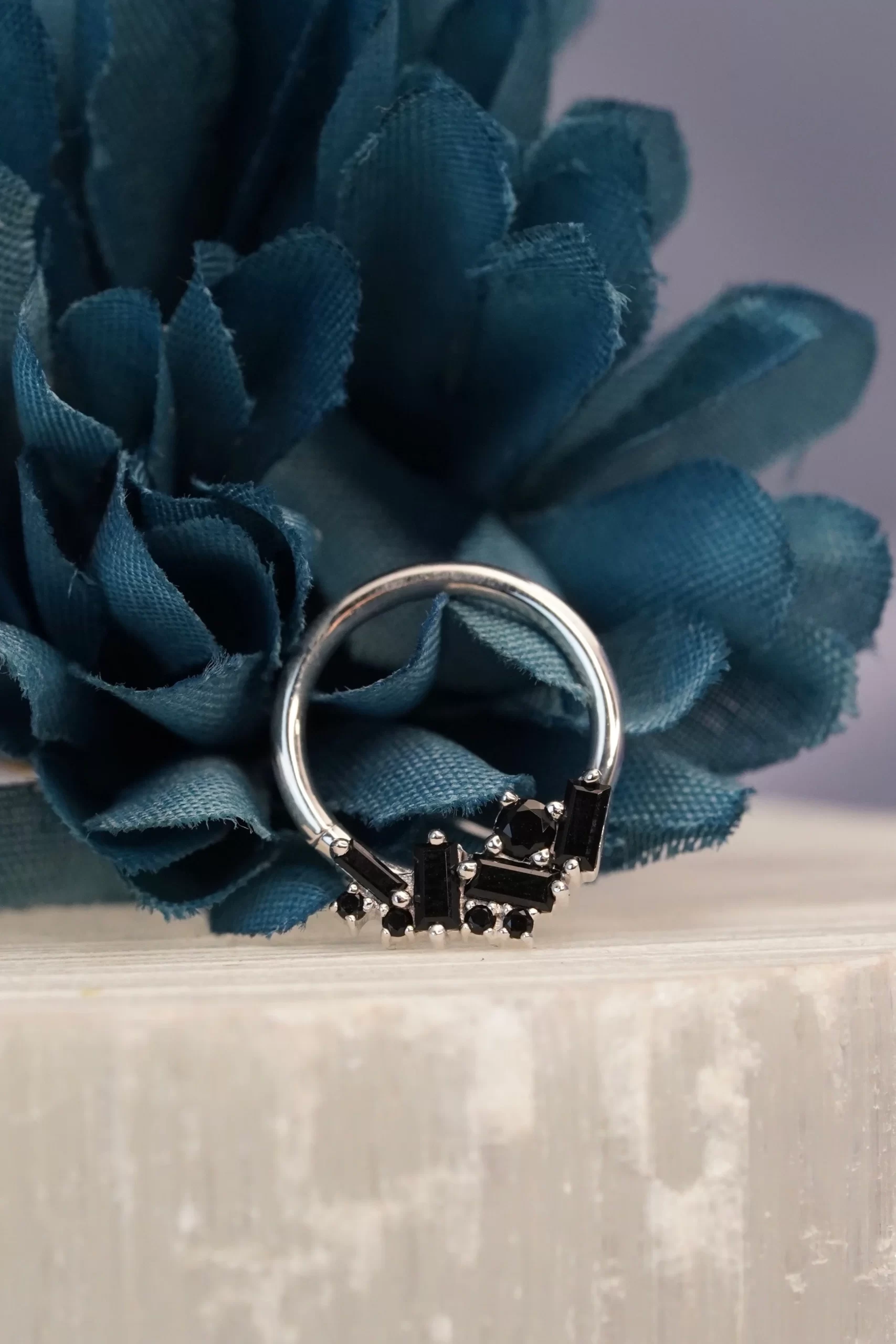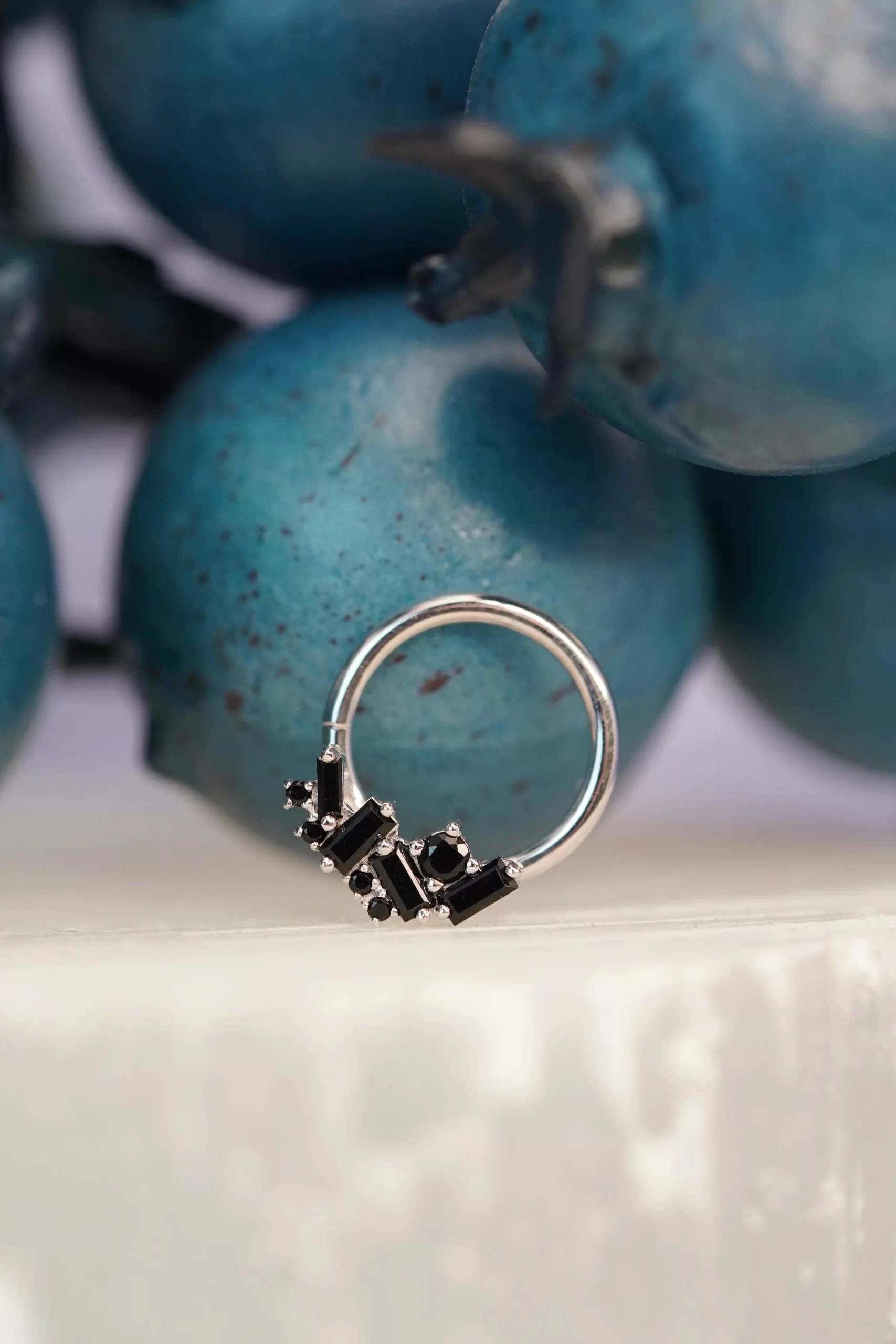 The “Myriad” handcrafted by Body Vision Los Angeles features nine genuine Black Onyx stones set in 14 karat solid White Gold. This hoop has a 9×6mm gem cluster holding 3×1.5mm and 2.5×1.25mm baguette stones, accented with 2mm and 1mm round stones. This piece is 16 gauge and 3/8” in diameter making it perfect for fresh or healed piercings!