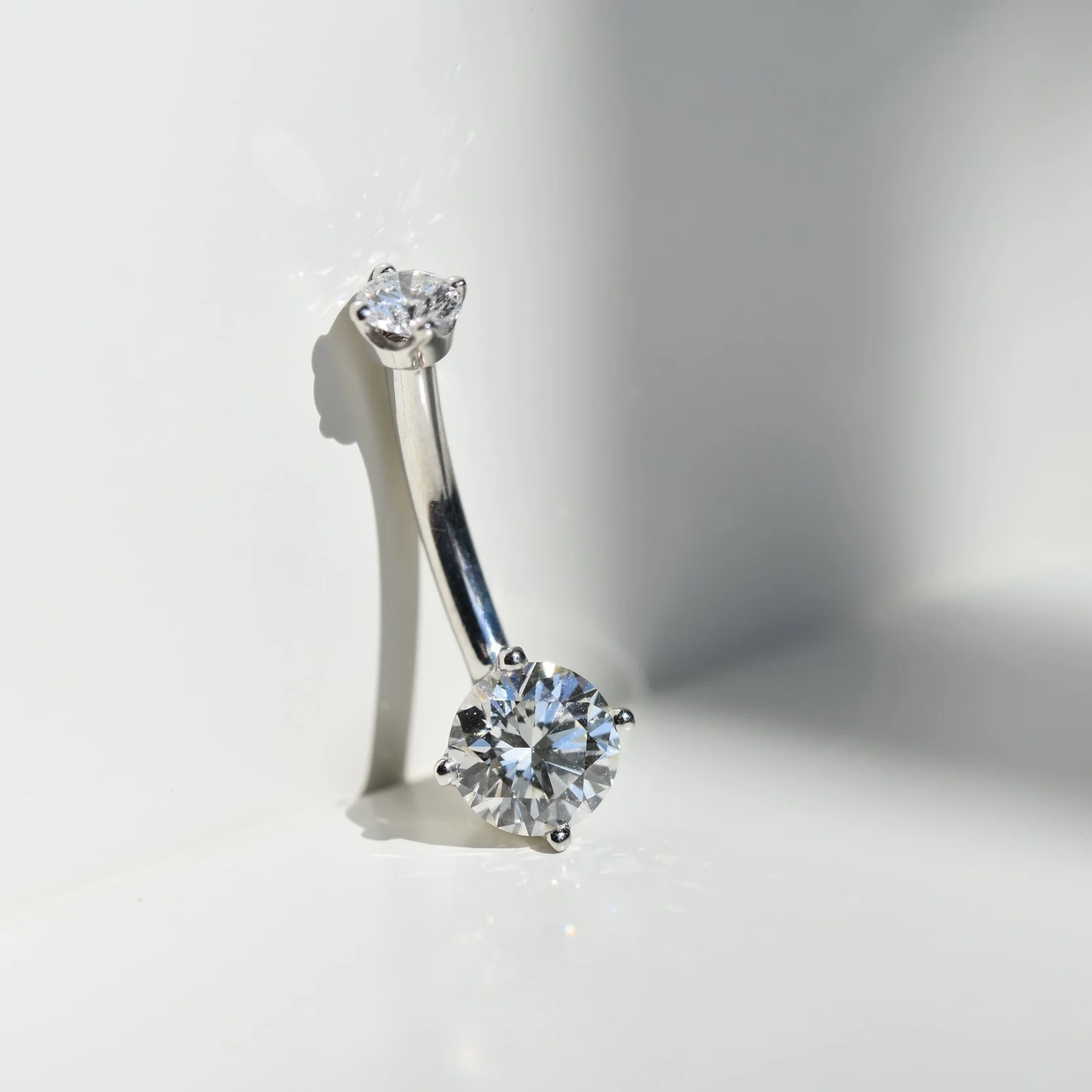 One of the most stunning pieces we’ve ever seen! These conflict-free diamonds shine brighter than you could imagine! This beauty has a 14g 3/8” wearing surface. Made with 14k solid white gold and two hand-set genuine diamonds! Truly stunning.