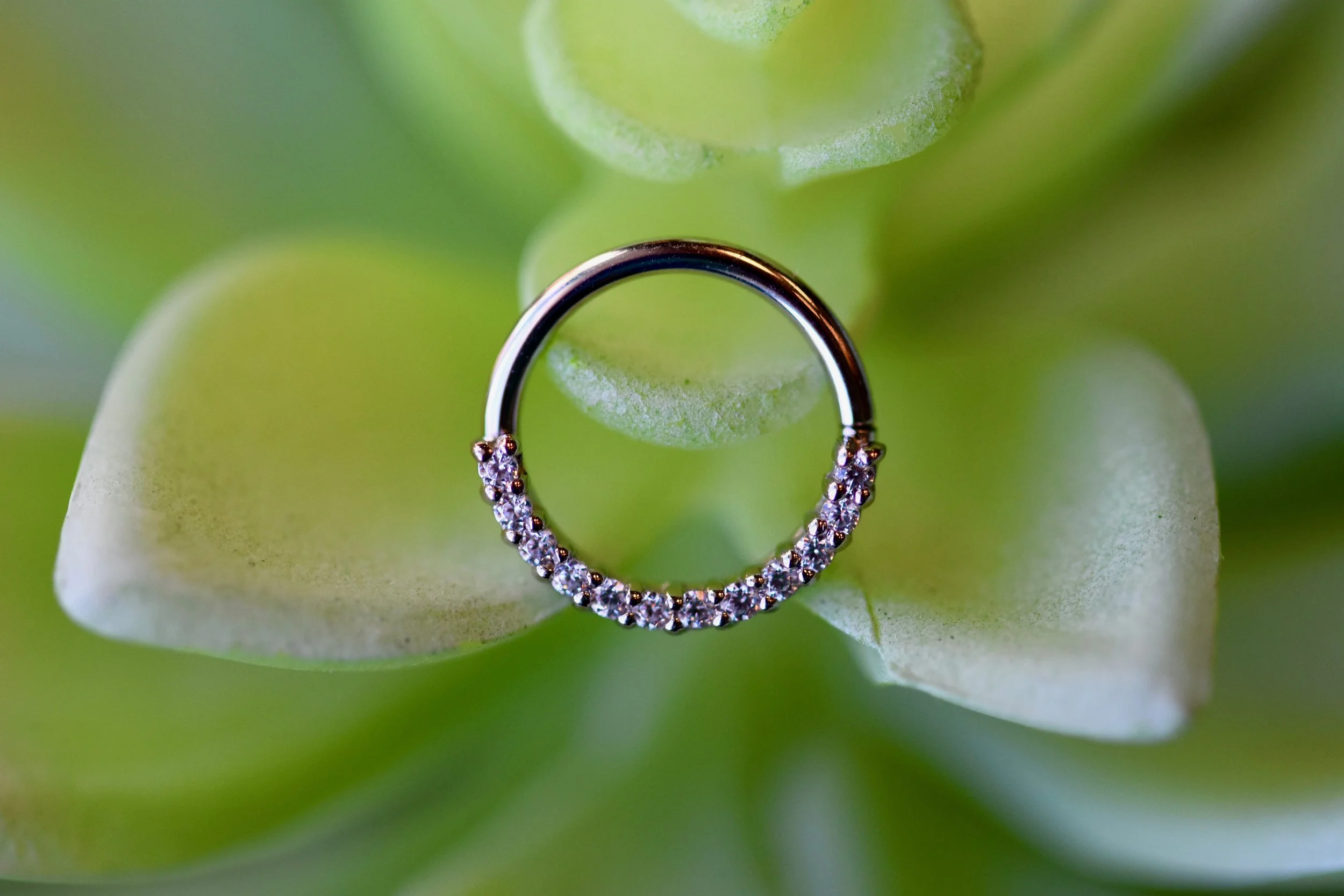 These 18g 14k solid gold seamless hoops from BVLA have a row of 1mm CZ’s. Perfect for a daith or septum piercing!