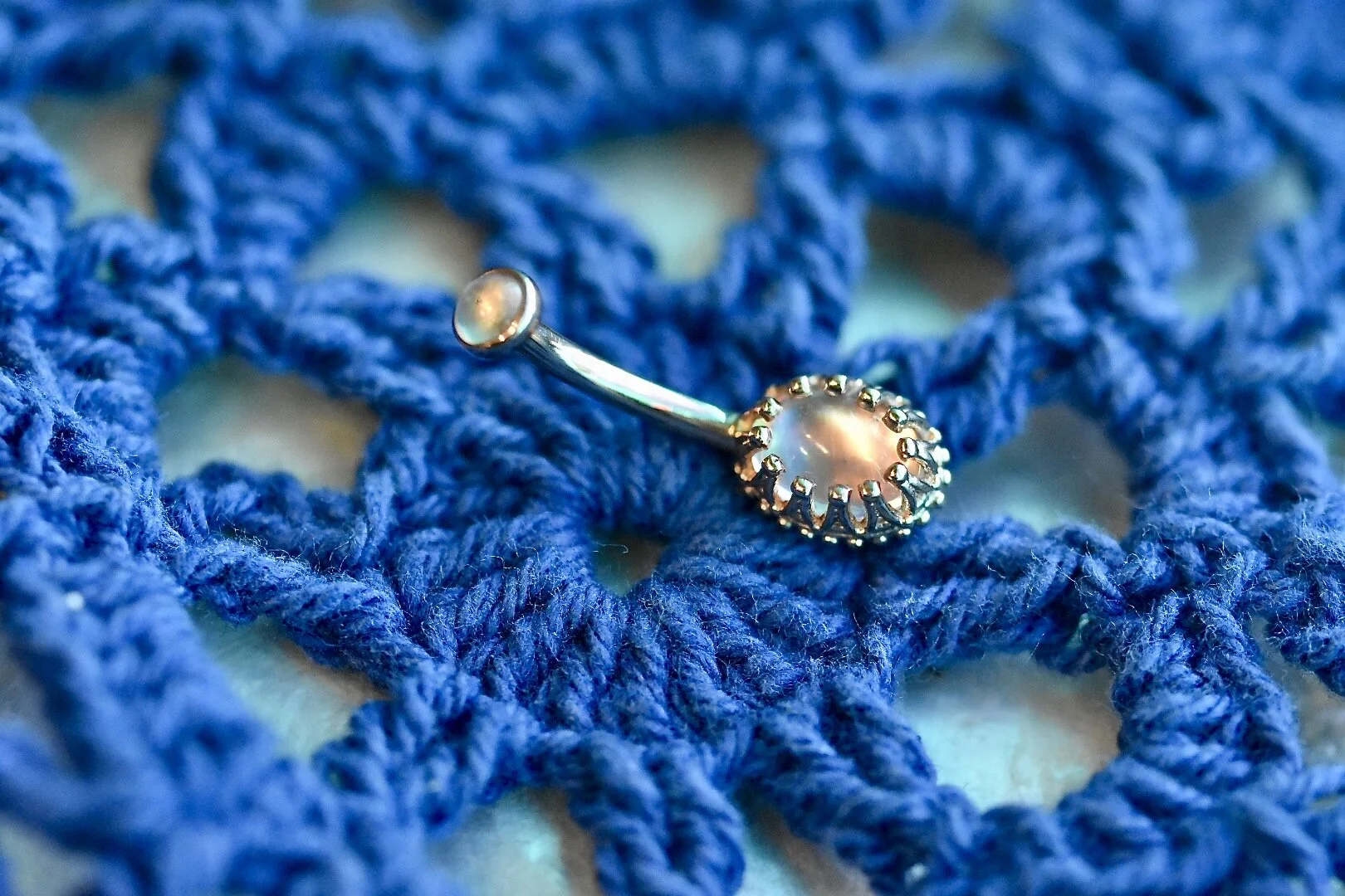 A stunning navel curve made with 14k solid rose gold and genuine Rainbow Moonstone. This piece is 14g and has 7/16” wearing length.