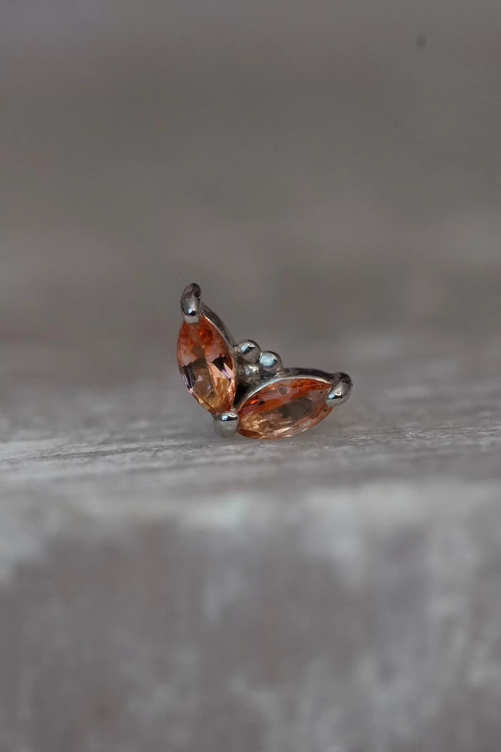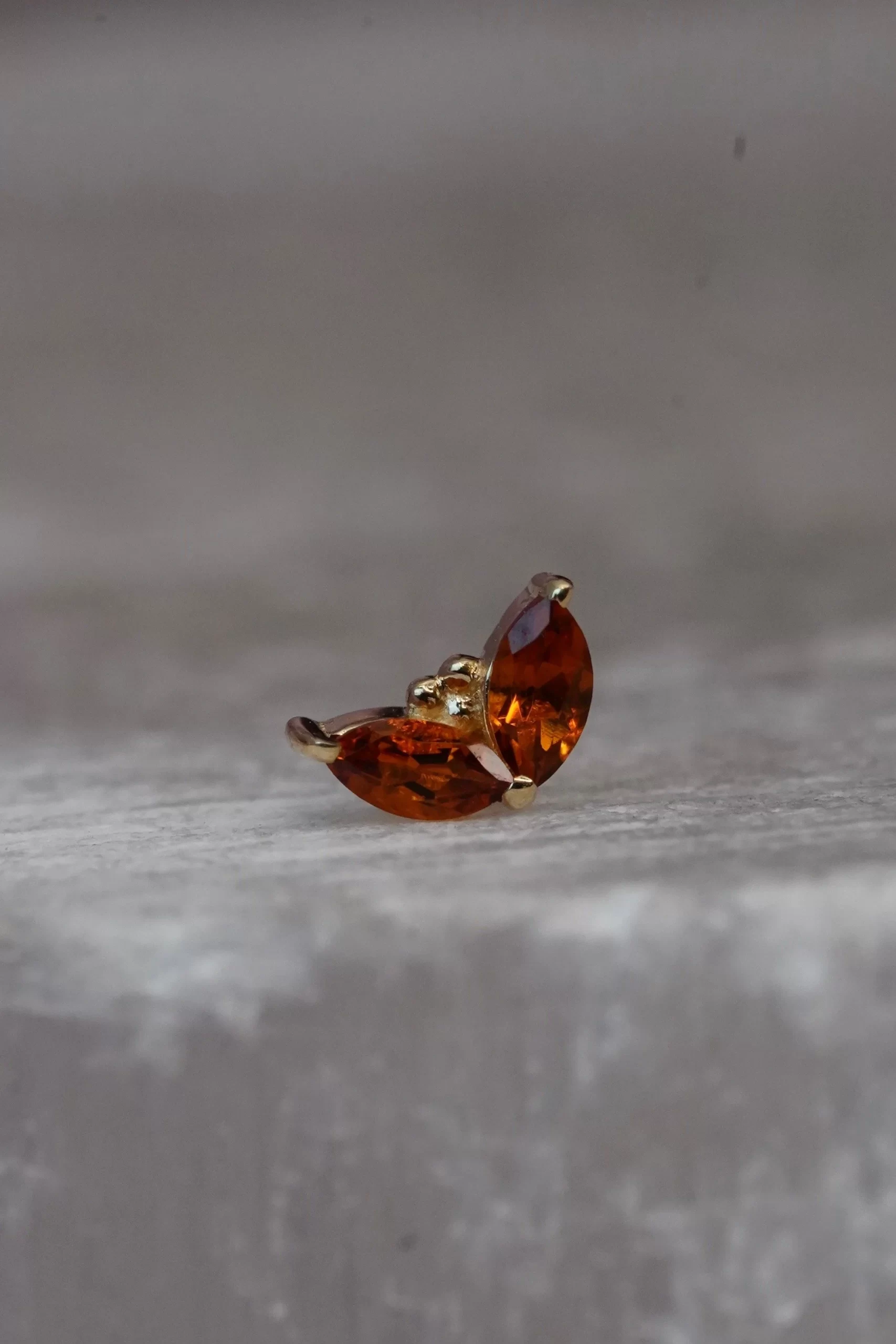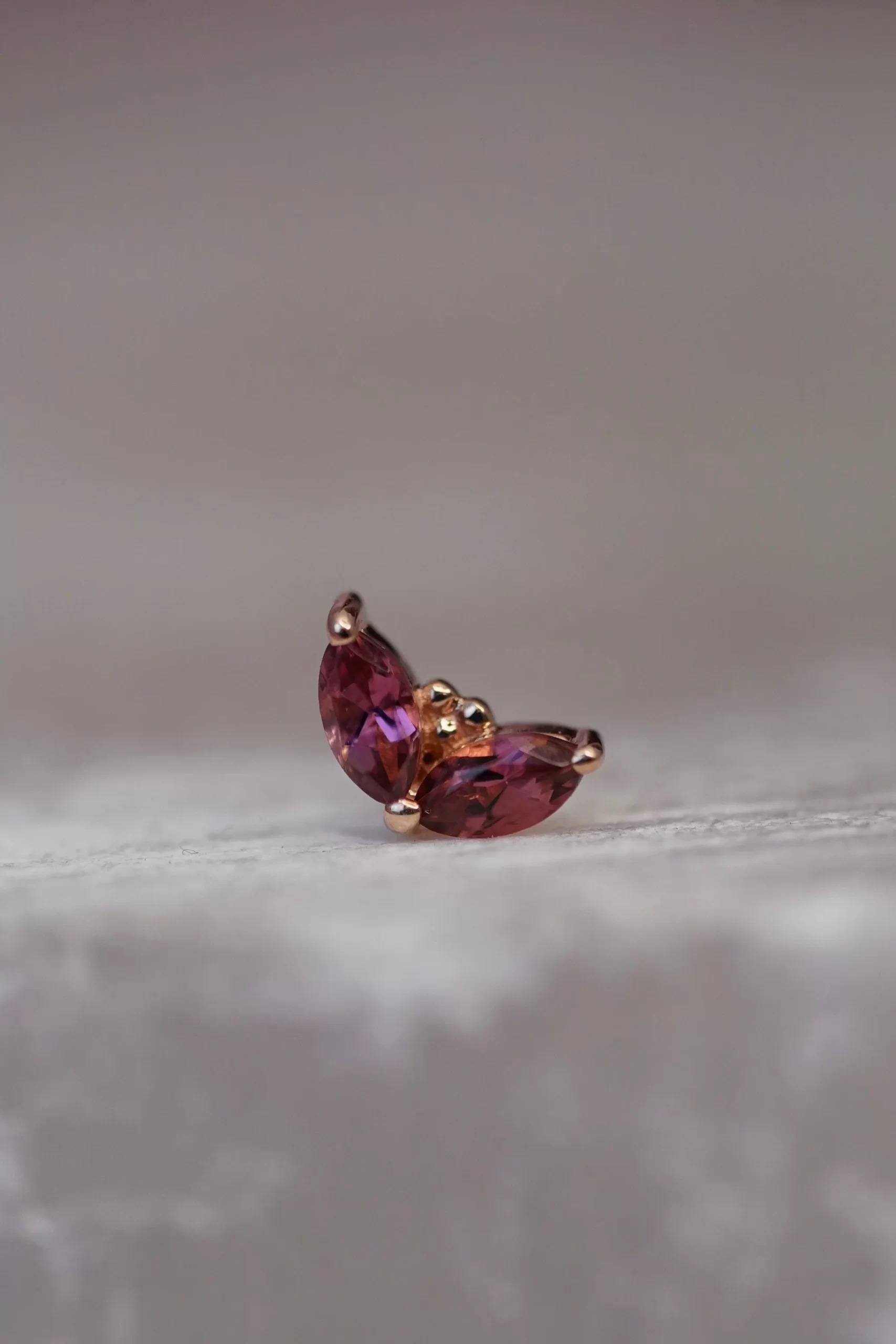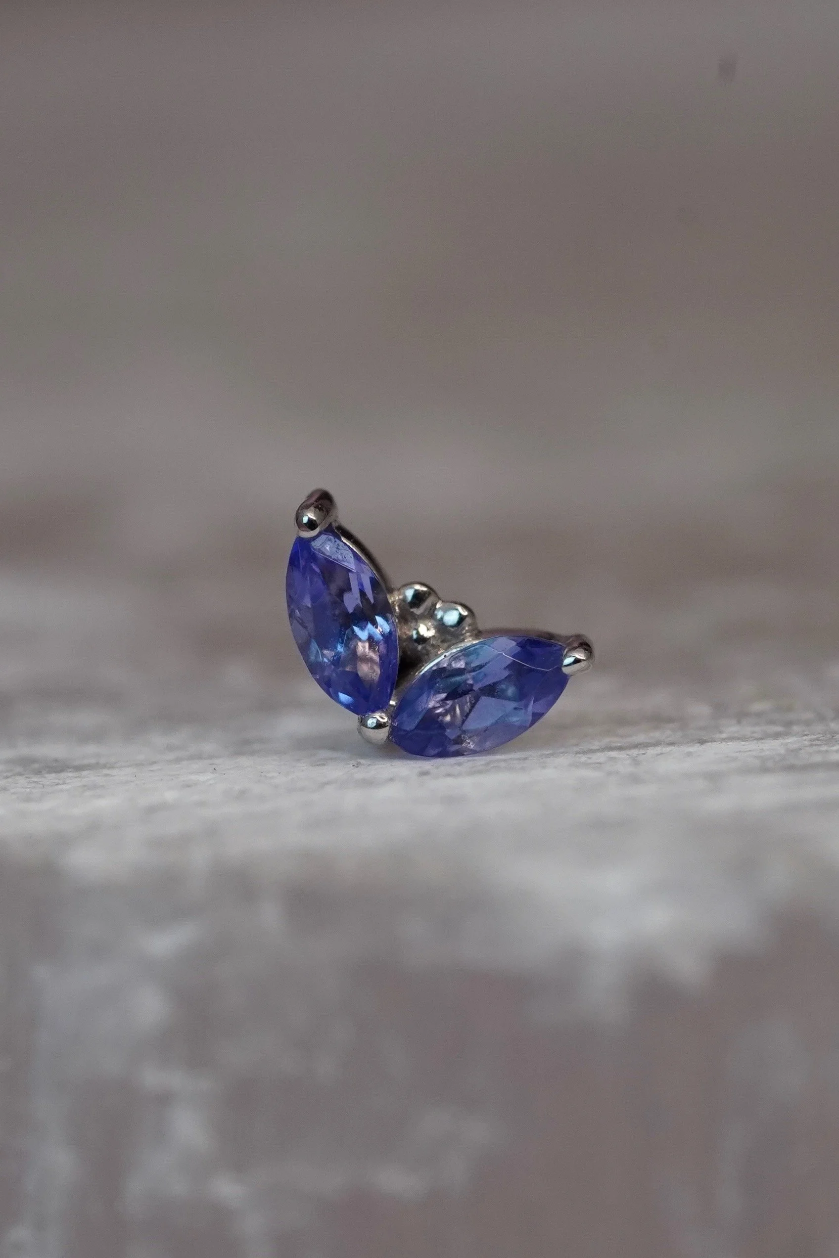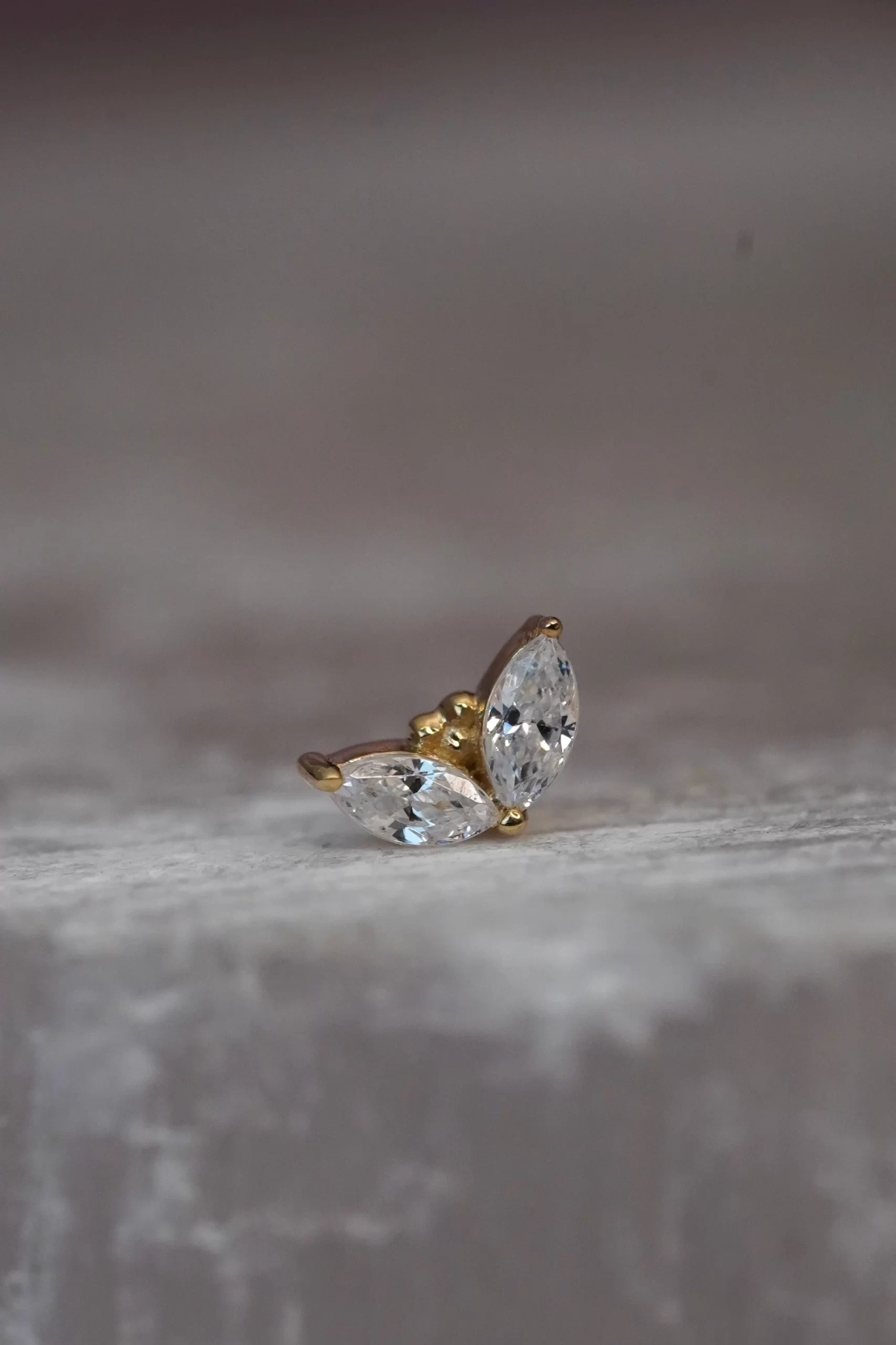 These lovely “Petals” handcrafted by Body Vision Los Angeles feature genuine gemstones set in 14 karat solid gold! These pieces have an overall diameter of 4×3mm, with two 3×1.5mm marquise cut gems. Compatible with an 18 or 16 gauge NeoMetal threadless post sold separately!