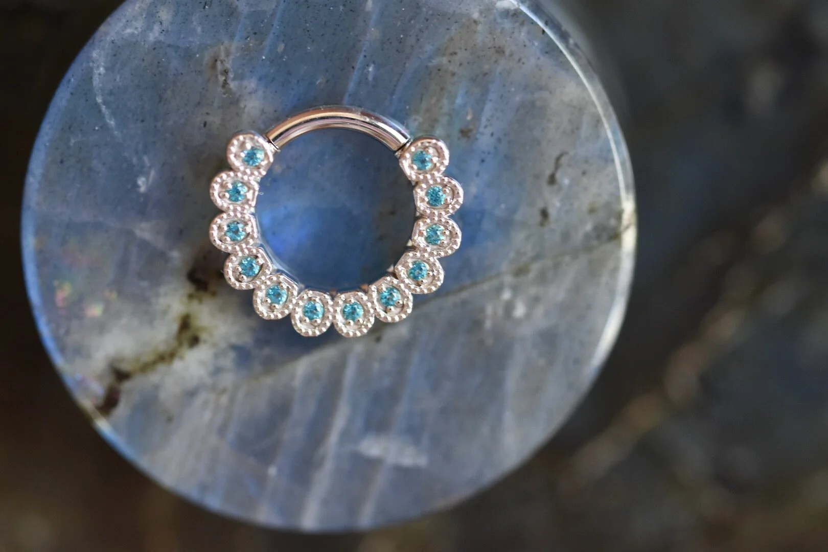 A stunning 16g 5/16” solid white gold clicker from BVLA made with a row of genuine Paraiba Topaz.
