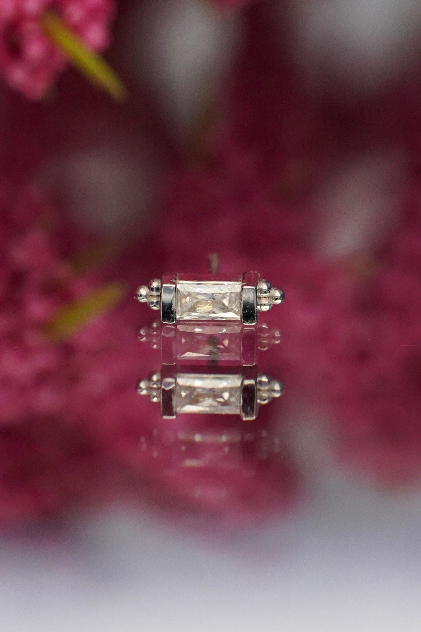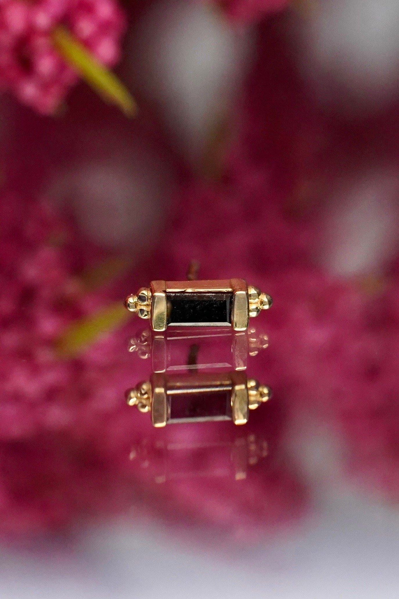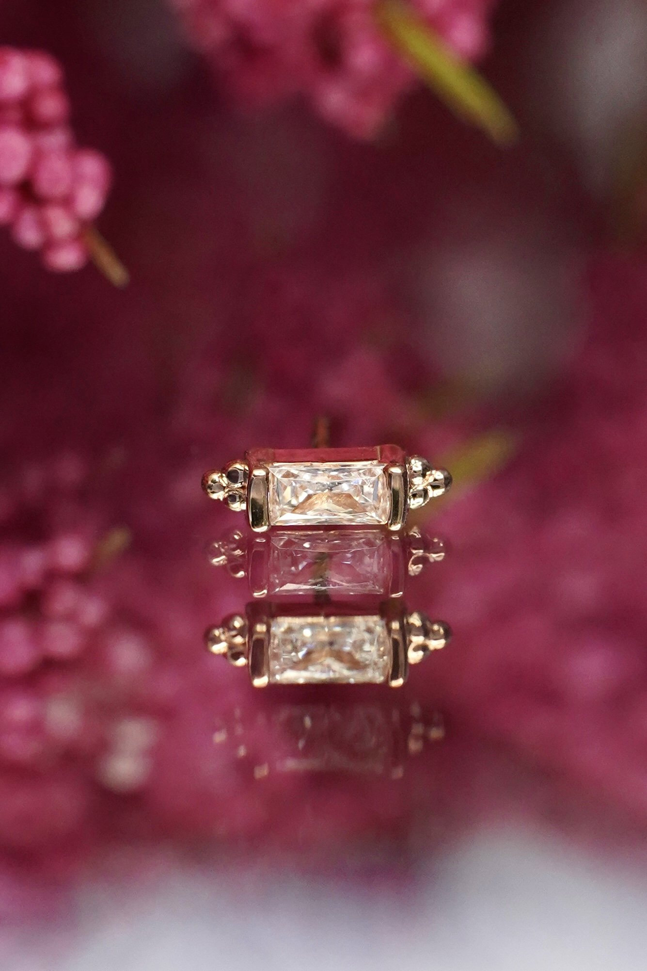 The “Siva” end handcrafted by Body Vision Los Angeles is such a versatile piece! Made with 14 karat solid gold, these pieces feature 3×1.5mm straight baguette cut genuine gemstones with a tri-bead accent on either side. They are compatible with a NeoMetal threadless post sold separately!