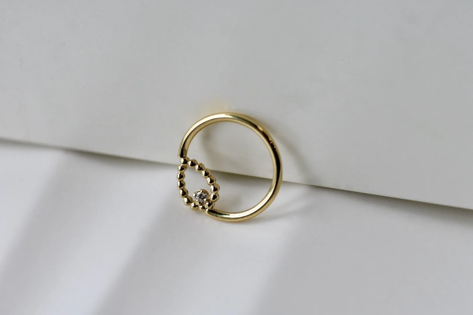 The ‘Sophie’s Tear’ seam ring from BVLA in a septum/daith orientation. Made with 14 karat solid gold by Body Vision Los Angeles. These seam rings are in an 18 gauge and 3/8 diameter featuring a cubic