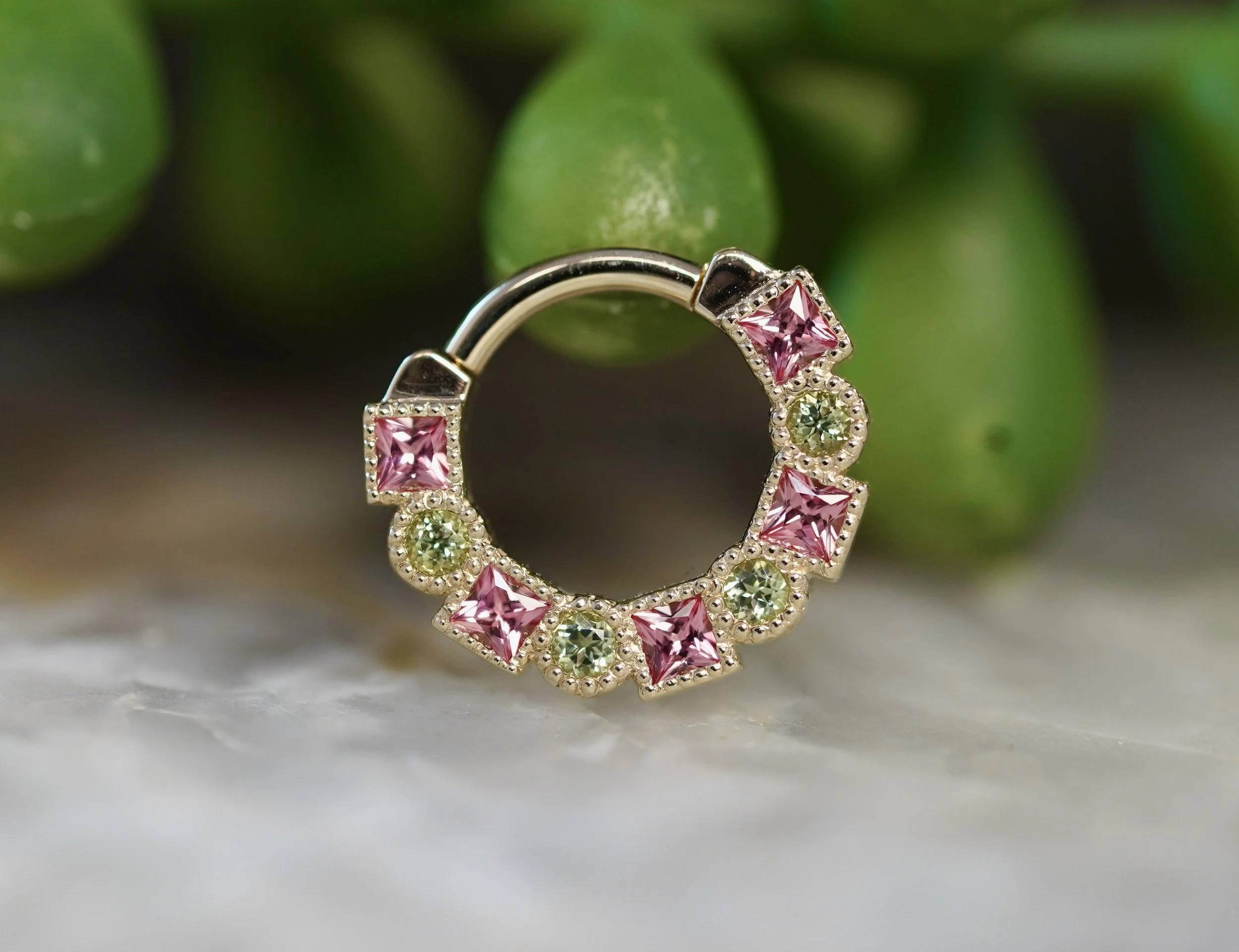 The Talus hinge ring handcrafted by Body Vision Los Angeles in 14 karat solid yellow gold featuring alternating 2mm princess millgrain bezel set Padparadscha Sapphires and 1.75mm round millgrain bezel set Peridot gemstones. Also available with all white cubic zirconia stones set in yellow gold or white gold. Each ring is 16 gauge and 5/16” in diameter. This piece would be beautiful in a healed septum or daith piercing!