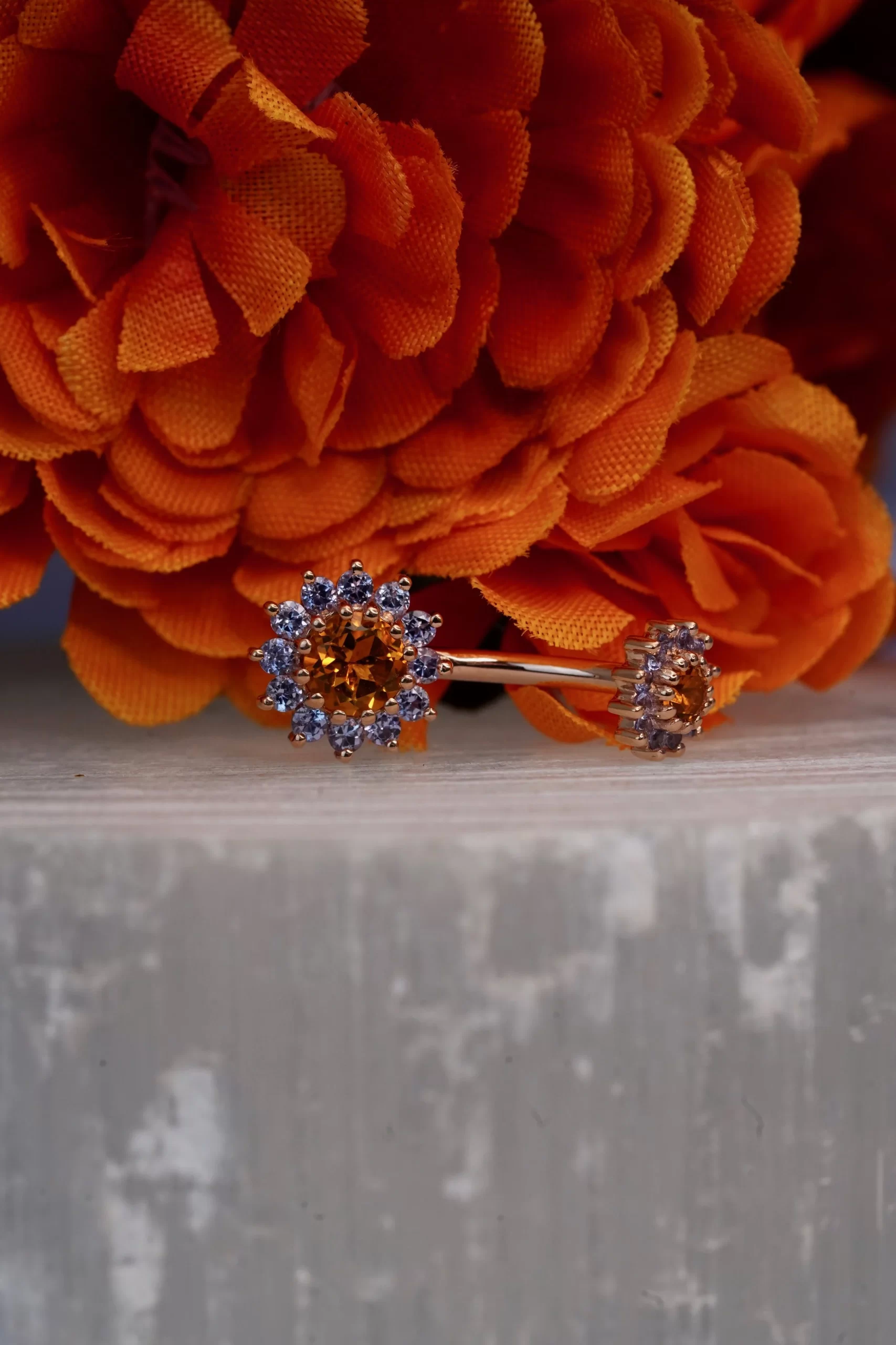 The Rose handcrafted by Body Vision Los Angeles features genuine Citrine and Tanzanite gemstones set in 14 karat Rose Gold. The bottom gem cluster holds a 5mm Citrine surrounded by 1.75mm Tanzanite stones, and the top gem cluster holds a 3mm Citrine with 1.25mm Tanzanite Petals. This piece is 14 gauge and 11/32” in length making it perfect for a healed navel piercing!
