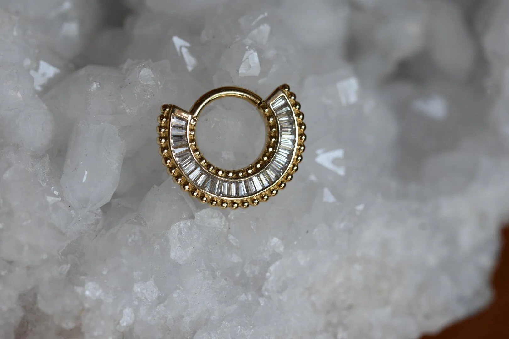 An incredible hinge ring with channel set tapered baguette White CZs, and bead accents made with 14k solid yellow gold. This beauty is 16g with a 5/16” wearing diameter. Perfect for a septum or daith