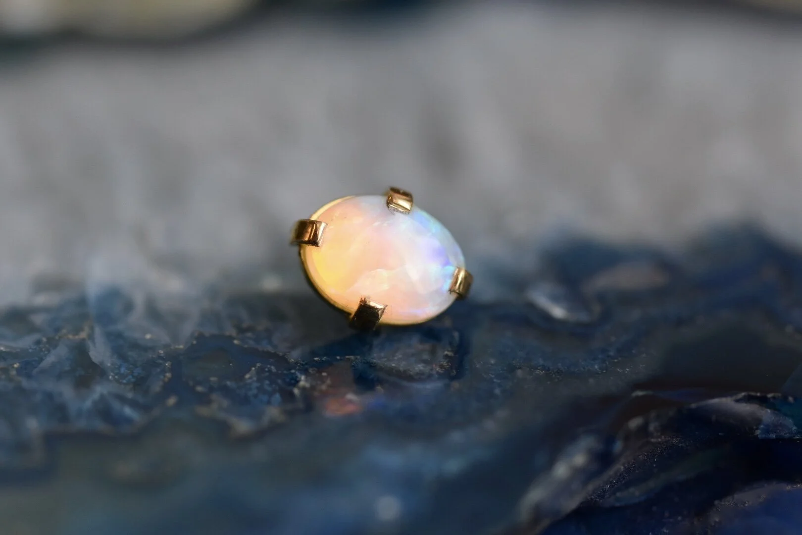 Stunning genuine opals prong-set in 14k solid yellow gold. They are threadless and measure approximately 10mm x 7mm with a height of about 3mm.