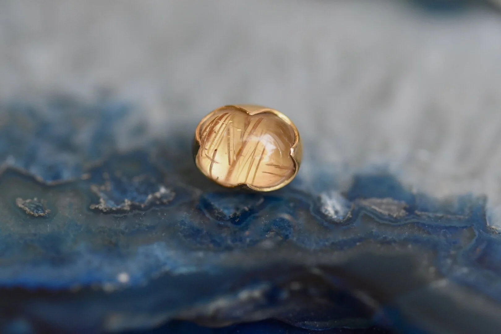 Genuine oval-cut Rutilated Quartz set in 14k yellow gold. These ends are threadless and measure approximately 7mm x 10mm with a height of about 5mm.