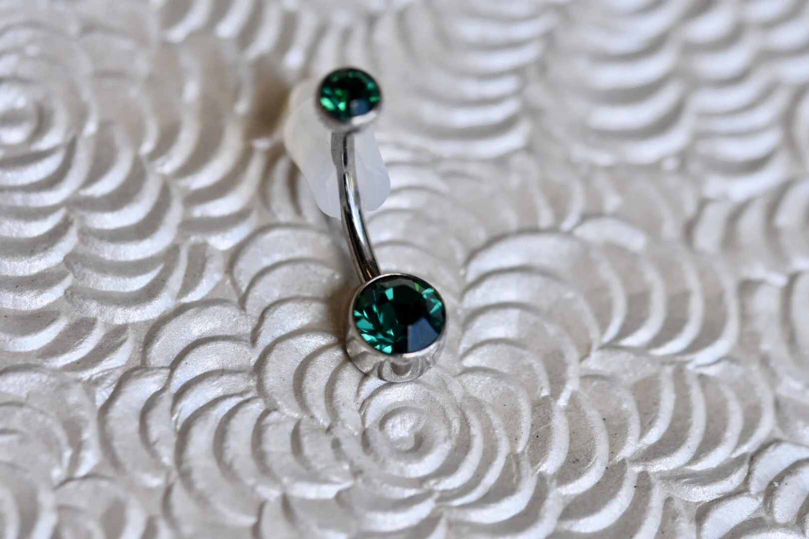 A 6mm bezel-set synthetic emerald in implant-grade surgical steel. 14g & 7/16” wearing surface.