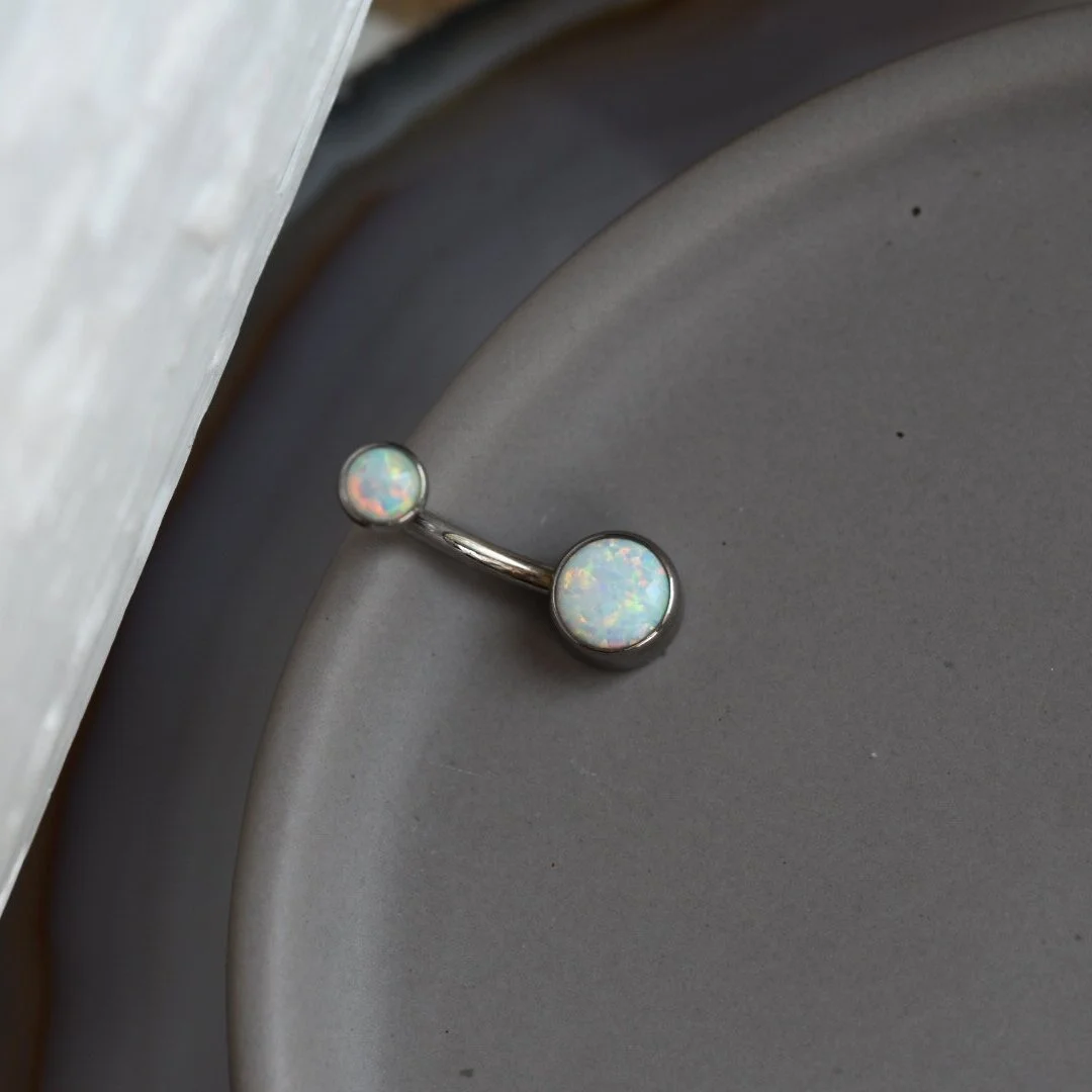 A 6mm bezel set synthetic white opal navel set in implant grade surgical steel. 14g & 7/16 wearing surface.