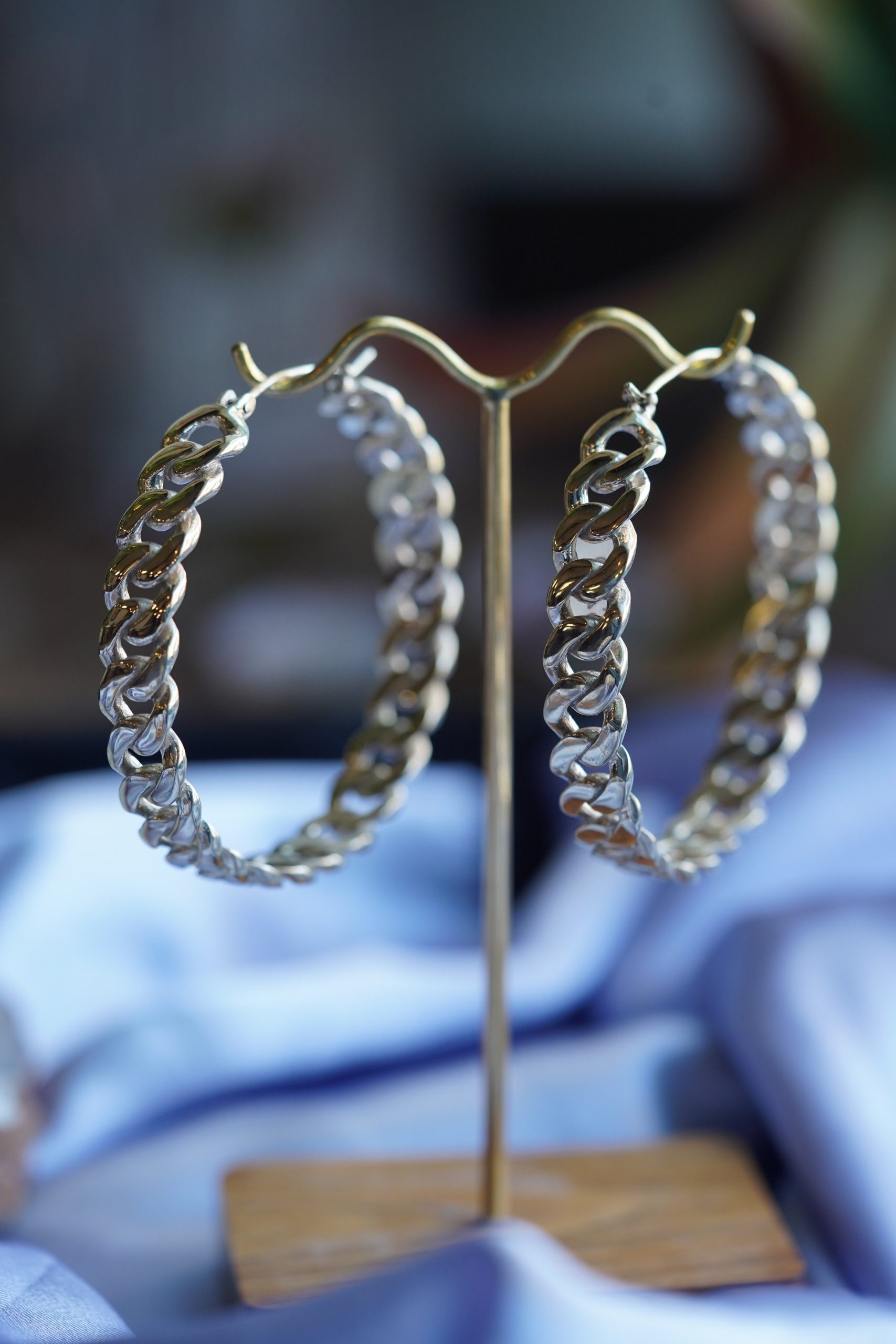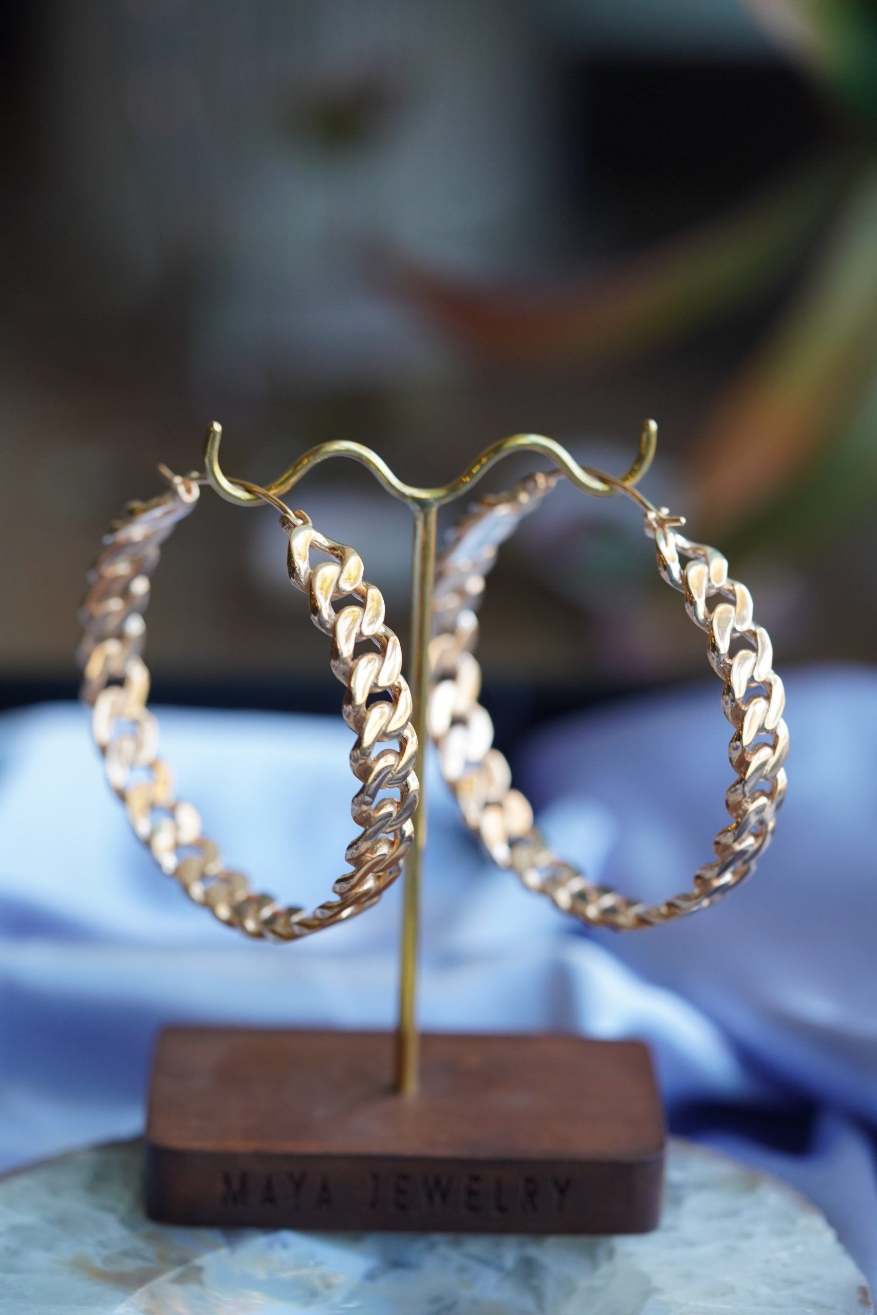 These hoops handcrafted by Maya Jewelry are a great statement hoop! Available in plated Yellow Gold, plated Rose Gold, or White Brass. These earrings are about 2.75”x2.75” and 21 grams each. They are made to fit standard ear piercings (18 gauge).