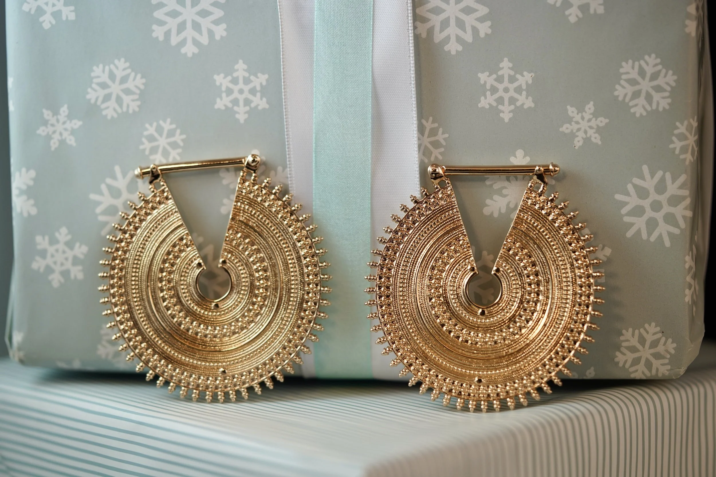 These beautiful, ornate hangers hand forged by Maya Jewelry are rose gold plated and feature layers of bead-like detail to give a visual texture. Must be 8 gauge to wear. Each hanger weighs 47g and is 3 inches in height and width.