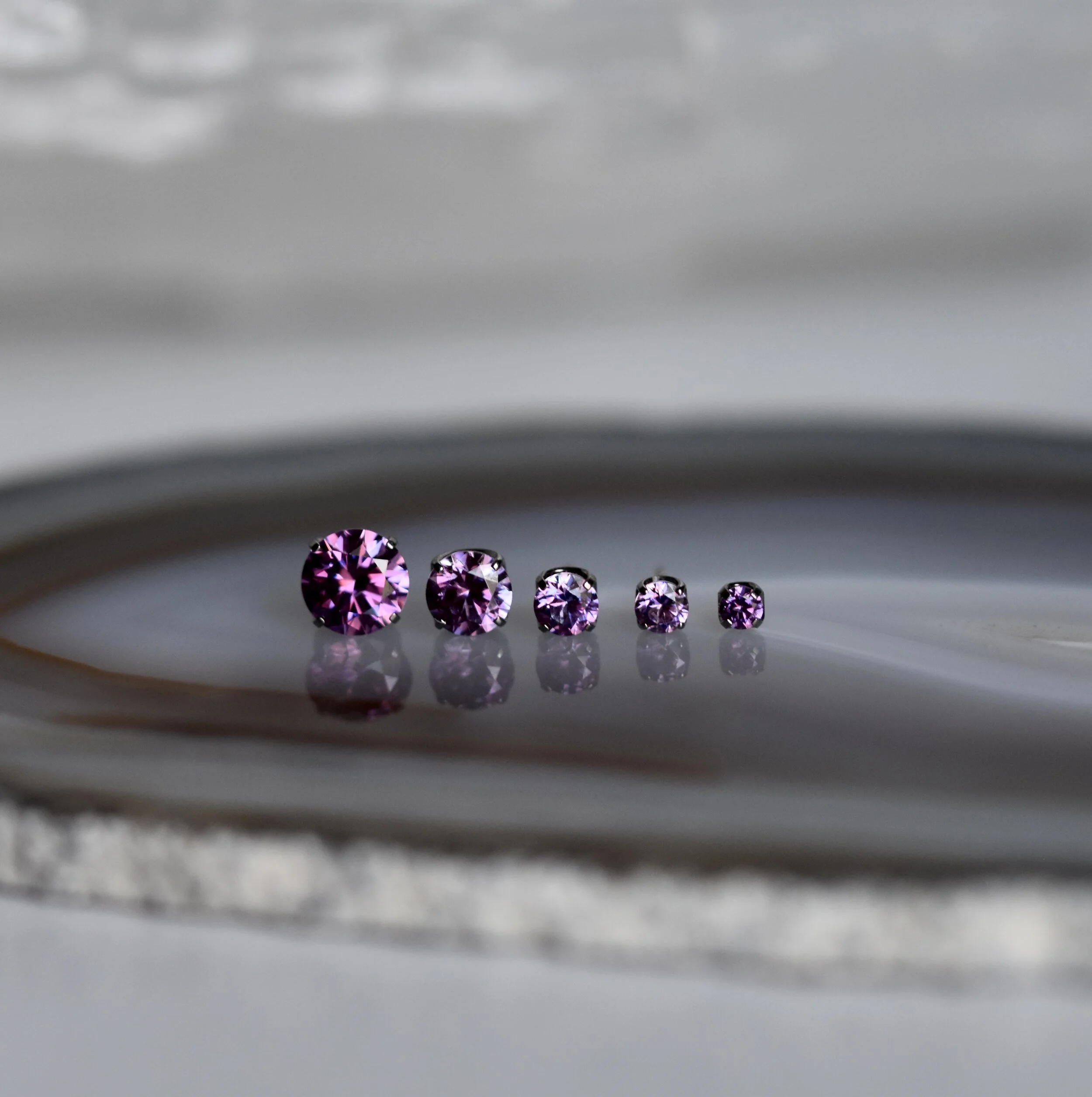 Fancy purple cubic zirconia in a titanium prong setting. Compatible with a threadless Neometal back piece.(Price is for the top only, and they are sold individually, not as a pair. A threadless post can be purchased separately)