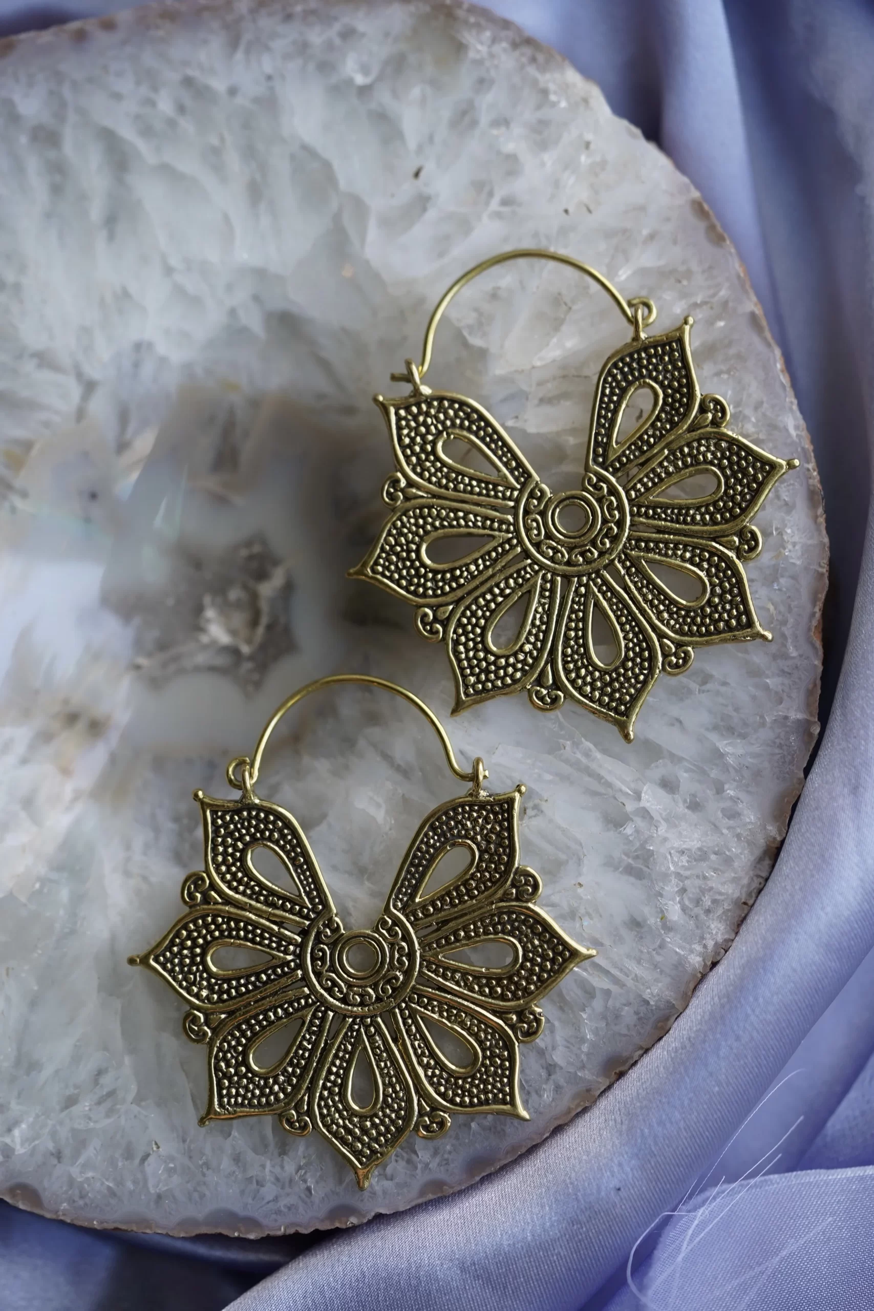 These gorgeous earrings are handcrafted by Safe Products Body Jewelry. Made with Yellow Brass, these earrings fit a standard piercing of 18 gauge or larger. They measure approximately 2”x2.25”.
