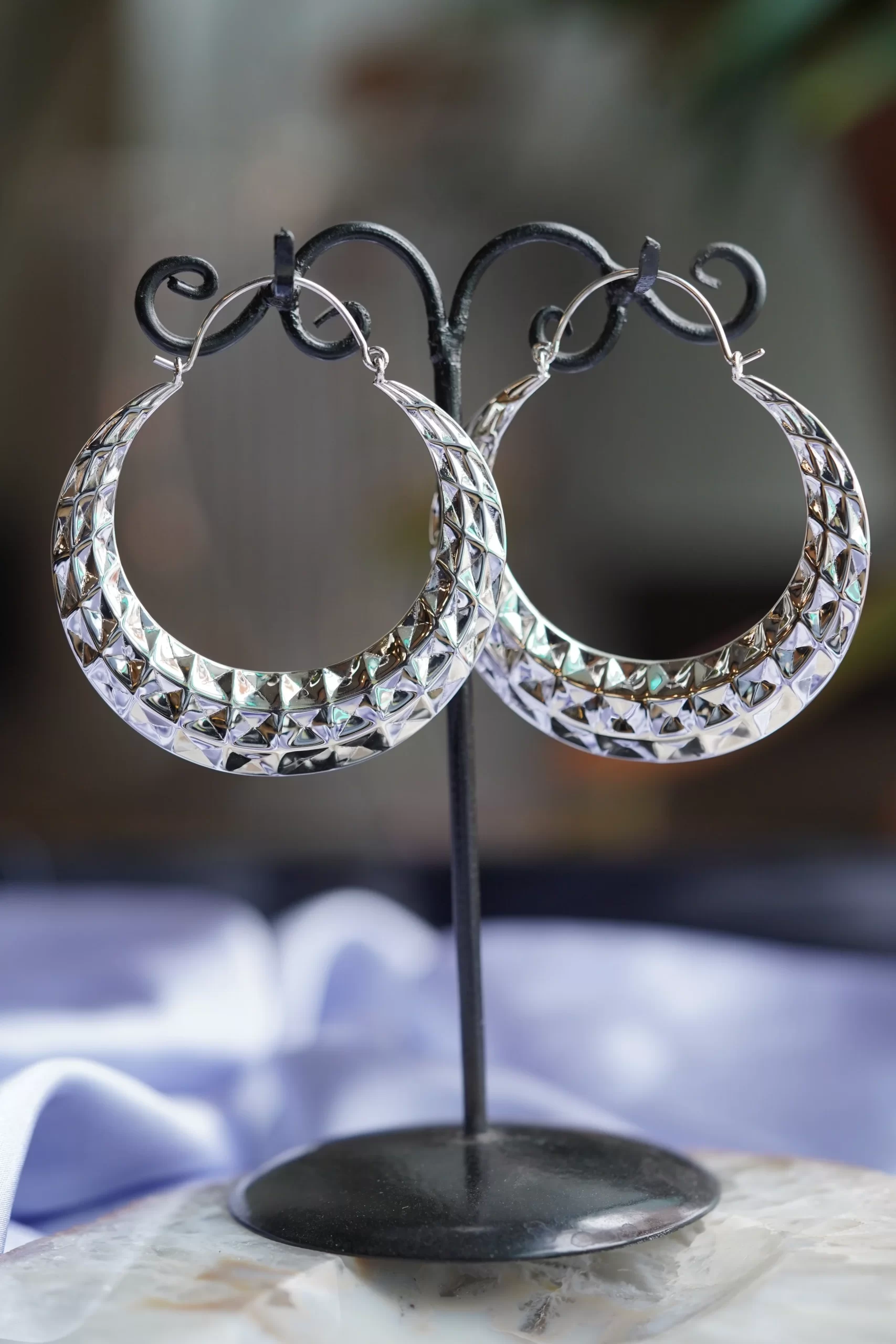 These gorgeous hoops handcrafted by Tether Jewelry are cast in brass and available in a Rhodium plated or Yellow Gold plated finish. Made to fit standard size piercings of 18 gauge or larger, these earrings measure 53mm x 58mm x 8mm and weigh 14 grams each.
