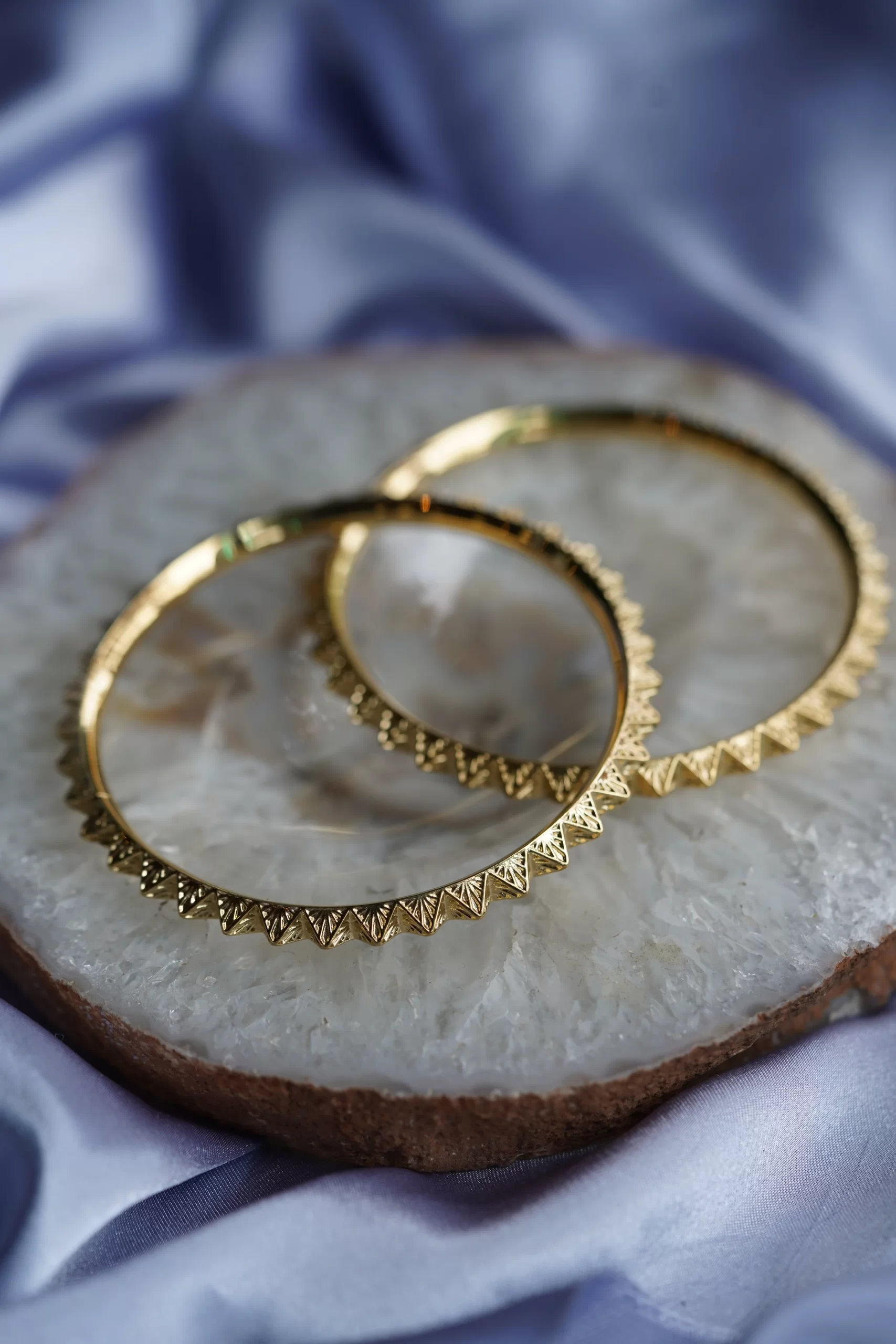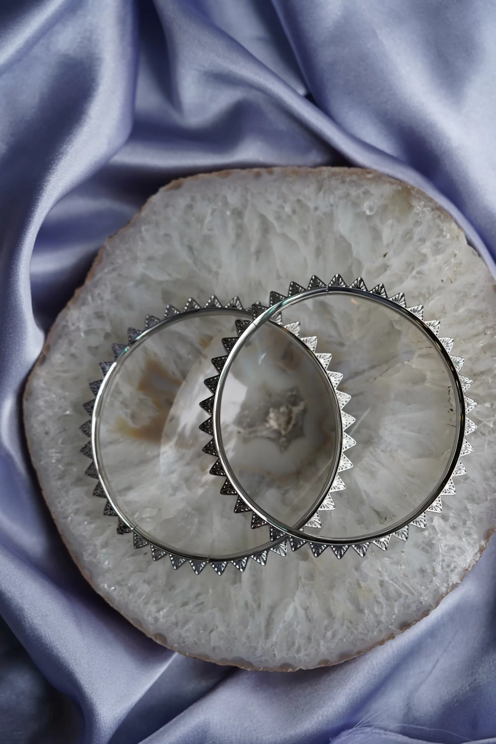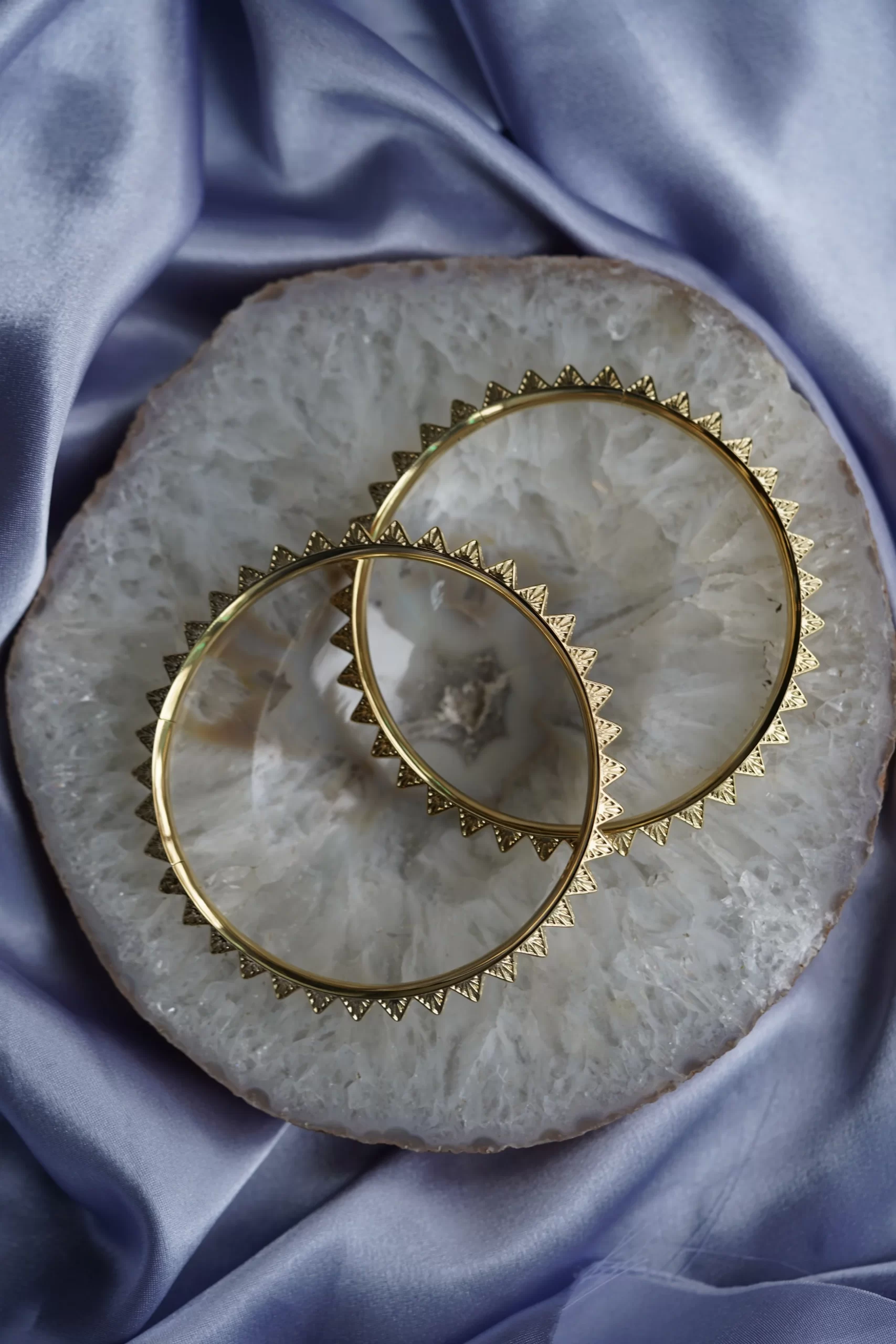 These gorgeous hoops handcrafted by Tether Jewelry are a great statement piece! Made with tarnish-proof steel and available in Yellow or Rose Gold plated, or a “Naked” silver tone. These spiked hoops have an inner diameter of 60mm with a 5.7mm wearing surface. Each piece weighs 24 grams, and ears must be stretched to 2 gauge or larger to wear.
