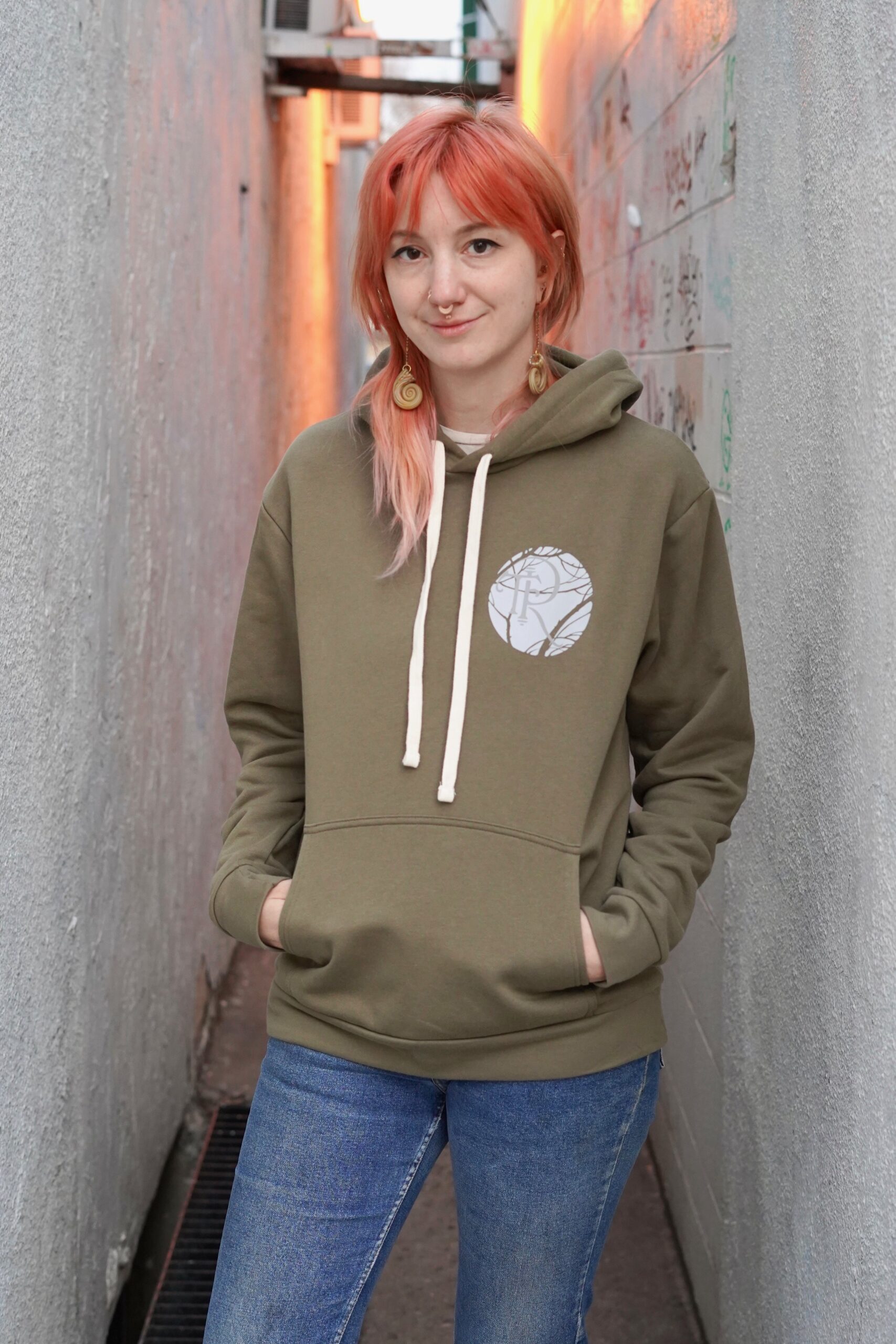 Sage green Next Level unisex hoodie with black and grey owl graphic design on the back and Tribal Rites logo on front left chest. 80% cotton, 20% polyester.