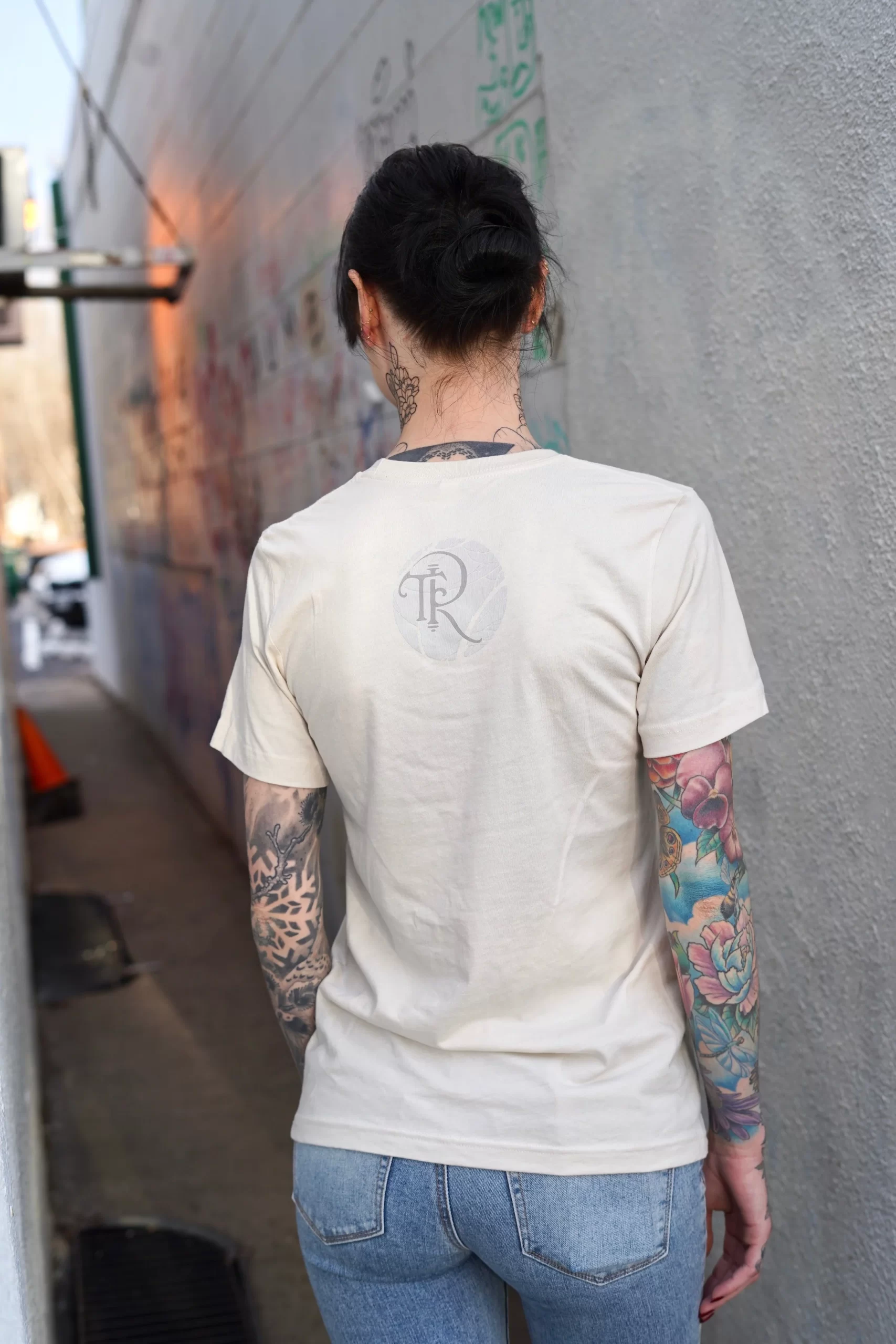Cream Bella + Canvas unisex tee with black and grey Owl graphic design. 52% cotton, 48% polyester.